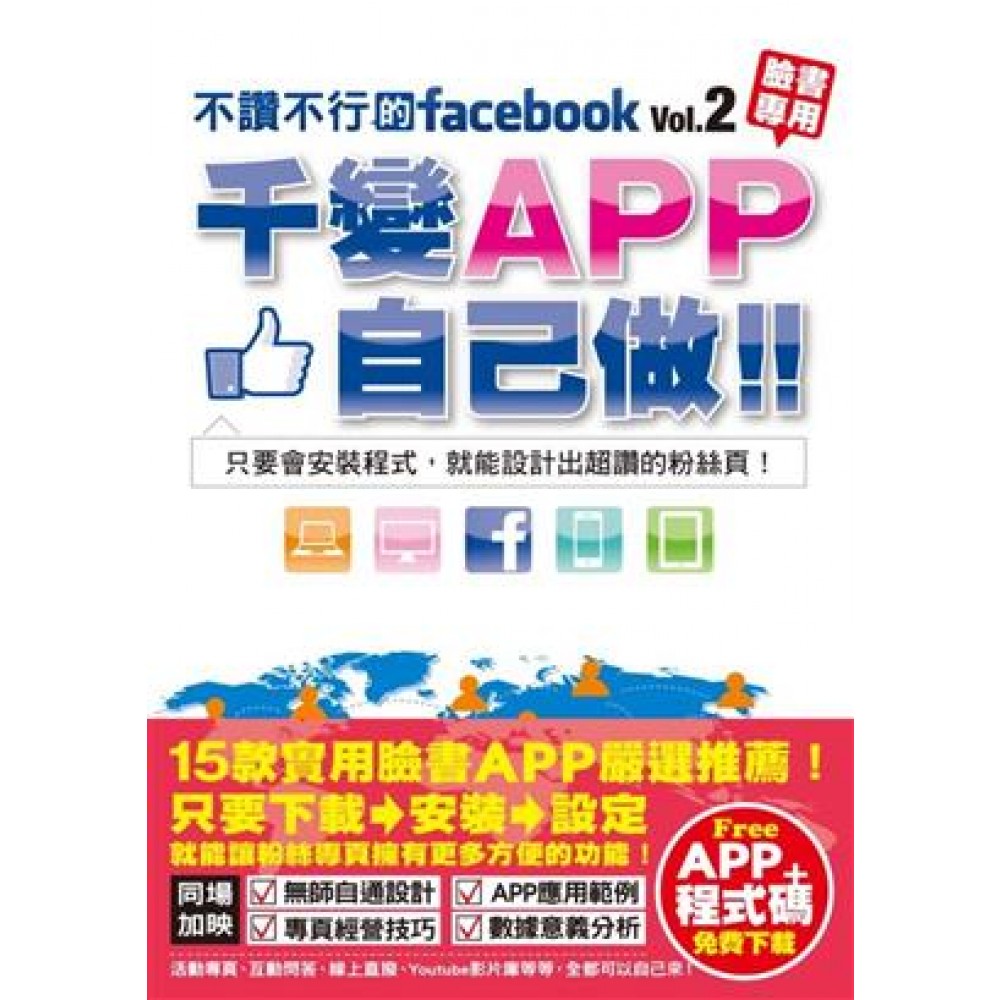 只要會安裝程式,就能設計出萬全的facebook粉絲頁! 社群網路帶來的行銷革命與通路革命早已開始,藉由全世界最大的社群網站facebook而行銷成功的案例每天不斷的發生。想要一嚐這社群威力的朋友,首先你們要瞭解,只想靠貼文字訊息和連結就想嚐到甜果,將會是你經營失敗的開始。 根據Pandemiclabs針對上億名臉書使用者習慣的調查,在專頁上貼圖片讓人點讚的機率,是比只貼網頁連結還要多出5倍在專頁上放影片讓人分享的機率,是比只貼網頁連結還要多出10倍這透露著一個訊息:你的專頁要做比別人的更活潑、更親近於粉絲,才有機會成功。 本書承接第一集《不讚不行的facebook:粉絲頁自己做!》的無須學會高深的程式語言就能自己做專頁的精神,這次將介紹實用的APP給讀者,讀者只要按步驟裝載到你的專頁就可以使用,「安裝」完畢之後,還會告訴你可以運用在哪些地方。這些能讓專頁更親近於粉絲的APP,本書還將教你怎麼設計,教法由淺入深、循序漸進,是你初探FB APP設計的入門關鍵。 而瞭解粉絲專頁發展狀況的洞察報告,本書也將針對每一個要素所代表的市場問題或含意,向讀者提出深入的釋疑與解釋。 Chapter1.先從檢視自己的專頁開始!點出一般需要經營臉書專頁老闆的錯誤觀念,並解釋臉書專頁的正確運作。 Chapter2.實用App介紹搜尋實用的app提供給需要經營臉書專頁的讀者。 Chapter3.App應用方法把app實際的應用方法寫出來,利用嵌入頁面的app編輯活動頁,並拿出幾本書作為獎品,實際舉辦活動並將過程寫到書中,讓讀者瞭解到,辦活動並非只有準備一大堆獎項才能辦。只要有創意,也能用少數的資金獲得意想不到的效果。 Chapter4.App實作單元除了上網找App之外,本單元要介紹讓讀者自行編寫App的方法。除了簡易的App 之外,還提供程式讓讀者能夠輕鬆的編寫高級的App,製作出符合自己需求的App。 Chapter5.經營專頁一把罩以條列方法介紹經營專頁的秘技,讓想要經營臉書專頁的讀者,都能夠順利的吸引到臉書的粉絲,並且順利的經營下去。 Chapter6.分析數據更上一層樓臉書的頁專除了經營的秘技之外,其實臉書官方還提供了洞察報告這項功能,提供給經營者各項數據以便在經營方向上進行微調。但是很多專頁的經營者都不知道這些數據中所隱藏的力量,本單元就是要告訴讀者們,洞察報告有多麼重要。