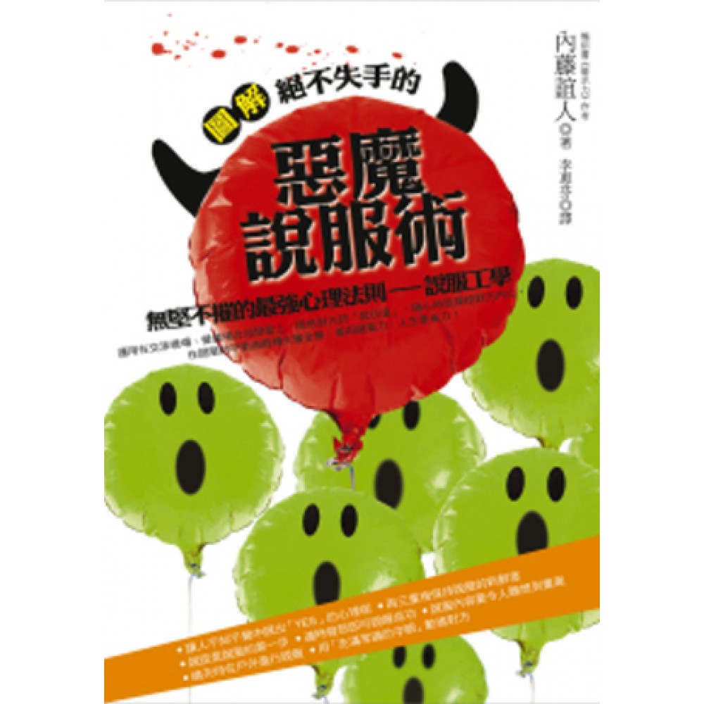 無堅不摧的最強心理法則──說服工學複雜又帶有危險魔力的說服工學,運用在交涉現場、營業場合或戀愛上,降低對方的「抵抗值」,隨心所欲操控對方內心,在說服的平衡遊戲裡大獲全勝,善用說服力,人生更省力! 讓人不知不覺中說出「YES」的心理術 ◎再三重複保持說服的新鮮度 ◎說謊是說服的第一步 ◎適時發怒即可說服成功 ◎說服內容要令人聯想到畫面 ◎晴天時在戶外進行說服 ◎用「充滿常識的字眼」動搖對方如何讓對方聽自己的話?如何堅持自己的主張?如何讓意中人喜歡自己?說服是「力學」的巧妙應用。以「力量」扭轉別人的心時,對方勢必產生「抵抗力」。如何增加自己的「力量」並削弱對方的「抵抗力」,正是本書介紹的惡魔心理術。從初級篇、中級篇、高級篇、達人篇、密技篇循序漸進,以淺簡易懂的圖解方式說明。