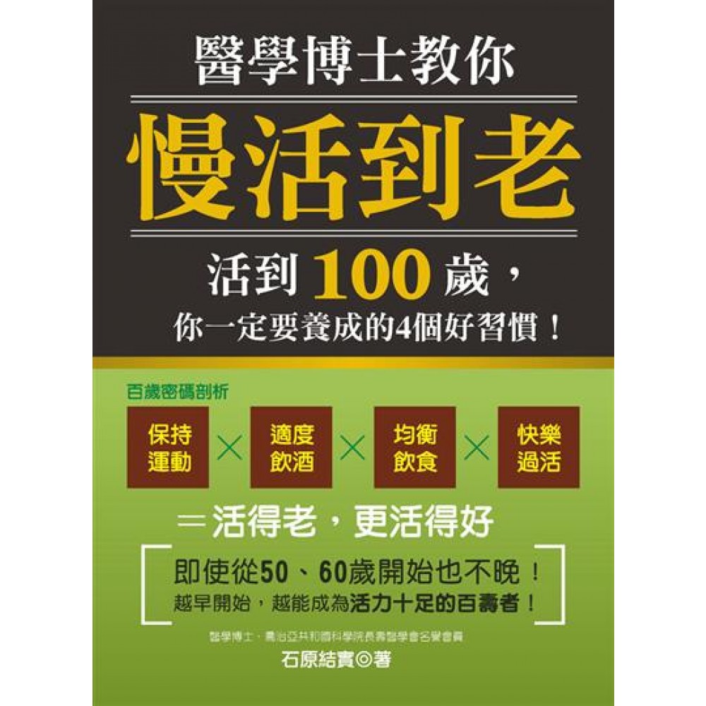 前 言 第1章 長壽者教導的長壽條件 史上有名的世界長壽者 日本的長壽者們 高加索地區百歲人瑞的生活 乾杯乾不停的高加索大型宴會/訪問百歲者所獲得的長壽秘訣/長壽的秘訣在飲食 日本長壽者們的生活 會帶來「長壽」的條件 第2章 活到100歲的第一個習慣──只要做這些運動就對了 活到100歲的四種習慣 養成日常做運動的習慣 下半身的肌肉尤其重要 腹肌力量也攸關健康.長壽 漢方中也提到「腎虛」=下半身肌力低下就是老化的開始/「是否能活得長久」的簡單預測法 做肌肉運動的方式 立刻就能做的肌肉運動○1 走路/立刻就能做的肌肉運動○2 深蹲(squat)/立刻就能做的肌肉運動○3 抬腿運動 鍛練上半身會更加提高效果 立刻就能做的肌肉運動○4伏地挺身/立刻就能做的肌肉運動○5萬歲運動/立刻就能做的肌肉運動○6曲膝腹肌運動 第3章 活到100歲的第二個習慣1──預防老化的食物 攝取蔬菜、水果、茶等抗氧化力強的食物 根莖類是防止老化的「長壽蔬菜」 紅蘿蔔/牛蒡/山藥/生薑/大蒜、蔥、洋蔥、青蔥、韭菜 各種為了健康長壽的重要食物 海藻/大豆及大豆製品/豆腐/納豆/味噌/醬油/漬物/芝麻/魚、海鮮類/【魚的功效】/【其他成分】/魚類所含的脂肪(EPA、DHA)/海鮮類(墨魚、章魚、蝦、蟹、貝類)/茶(綠茶.紅茶)/ 第4章 活到100歲的第二個習慣2──預防老化的飲食方式 實際的用餐方法 日本人一日三餐,太多了/理想的早餐是:紅茶+黑糖+生薑與紅蘿蔔.蘋果汁/中餐是完全營養食物:「蕎麥麵」+青蔥+七味唐辛子/「配料很多的烏龍麵」+青蔥與七味唐辛子、加大蒜的義大利麵 【石原式基本飲食】 嘴饞想要吃東西時就念這些句子 從漢方的陰陽論來看長壽飲食 鹽正是陽性食物的代表 第5章 活到100歲的第三個習慣──合宜地攝取酒精 適度的喝酒 酒精的功效 第6章 活到100歲的第四個習慣──人生要活得快樂 擁有很多的朋友.熟人,常以積極向上的心情,肯定愉快地度過人生 開懷大笑/在卡拉OK高唱老人贊歌/從芬蘭症候群獲知的事/最後 第7章 預防「5種疾病」以便能活得長壽 預防「高血壓」「腦梗塞」「心肌梗塞」的訣竅 預防糖尿病的訣竅 預防癌症的訣竅 第8章 從檢查報告解讀血液的老化 依血液檢查的診斷 水分/蛋白質/脂肪/糖分/糖化血紅素(glycohemoglobin)/酵素/老舊廢物/腫瘤標記/急性期蛋白質/有形成分(血球)/血沉 從血液檢查診斷疾病 健康檢查結果要這麼解讀。A氏(45歲.上班族)/因貧血而蛋白質很少、但血中脂質很多的B小姐(38歲.家庭主婦)/因糖尿病而有腎功能衰退、貧血可能性的C先生(65歲.公司社長)/營養狀態乍看之下良好,卻有罹癌症疑慮的D先生(48歲.上班族)/不喝酒的「脂肪肝」。E先生(44歲.上班族) 關於血液的「老化」 (1)紅血球、血紅素(Hb)、血球容積比(hematocrit)值的降低/(2)白血球數的減少/(3)CRP值高/(4)血沉/(5)白蛋白值的低下/(6)肌酐酸值的上升/(7)ALP值的上升