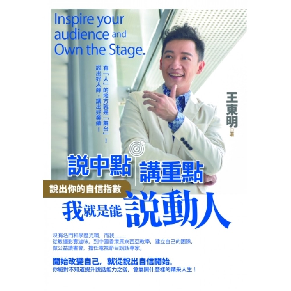 Inspire your audience and Own the Stage! 有「人」的地方就是「舞台」! 說出好人緣,講出好業績! 沒有名門光環和學歷,而我… 從教攝影賣滷味,到中國香港馬來西亞教學,建立自己的團隊, 做公益讀書會,擔任電視節目說話專家。 開始改變自己,就從說出自信開始。 因為你絕對不知道提升說話能力之後,會展開什麼樣的精采人生! 謝文憲.陶淑貞.王永福.周震宇.唐崇達.吳佰鴻.汪逸仁.梁丹青.王子麵.筆記女王Ada.趙大鼻.吳憶如… 40名家達人.感動推薦