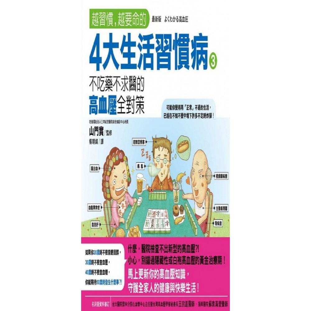 如果你20歲時不檢查膽固醇, 30歲時不檢查血壓, 40歲時不檢查血糖…… 你能期待50歲發生什麼事? —尚.伯罕敏醫生(M.D. Jean Bonhomme),美國Men’s Health Network董事 或許你外表看起來很健康,也自我感覺良好,但是,你真的可以安枕無憂嗎? 在你看不到、感覺不到的地方,你的身體可能正在發生變化—— 根據調查,台灣的健康成人中,有4.27%已經出現一處或多處「無症狀腦梗塞」, 當中不乏30多歲的壯年人,而他們在未來2到4年間的中風風險,比同齡者高2到10倍…… 你,還要對自己的健康問題繼續裝傻下去? 系列特色 .日本學習暨教育類出版社龍頭「學研教育出版社」最新力作! .精心手繪插畫+簡明扼要圖表+人人看得懂的說明! .高膽固醇、高血糖、高血壓、高三酸甘油酯:完全預防+對策! .教你第一次徹底看懂健康檢查的數據! 你一定不知道的高血壓真面目!! ◎多攝取10g鹽分,血壓就會升高10mmHg! ◎光吃一碗拉麵,就可能超過一天的鹽分攝取量! ◎在醫院測量血壓不一定最準確!為什麼有的人到醫院,反而血壓比平常還低!有的人卻血壓會飆得更高! ◎用蹲式馬桶或坐式馬桶解便,血壓上升的幅度不一樣! ◎運動不見得有益健康,不當的運動反而會加速死亡! 高血壓並沒有明顯的症狀,容易被人輕忽,等到發現時往往已經引發重大疾病,所以又被稱為「沉默殺手」。 高血壓會造成動脈不斷硬化,影響腦血管、心臟、腎臟甚至眼睛等重要臟器的功能。剛開始出現的可能是視網膜出血、腎硬化、腦梗塞、心肌肥大……。再置之不理,便會進一步演變成眼中風、腎衰竭、腦中風、心臟衰竭等危及生命的重大疾病,或讓殘疾跟著你一輩子! 沒特殊症狀的高血壓,有徵兆可循嗎? .沒來由地頭痛一陣陣襲來。 .發生間斷性或持續性耳鳴。 .手腳等末梢神經容易發麻。 .沒做什麼卻老是肩膀、後頸痠痛。 .明明沒落枕,早上起床卻覺得後頸僵硬。 .感覺周圍物體或自身在旋轉,或有搖晃浮沉的眩暈感。 .不時發生心悸,有時會胸悶、呼吸急促、冒冷汗,甚至胸痛! 這些看似不怎樣的小毛病,可能是蟄伏多年的高血壓埋下不定時炸彈的警訊!! 本書分為五大部分: PART 1. 圖解「血壓值」:用最簡單易懂的血壓值基礎知識,開始了解自己與血壓值的親密關係! PART 2. 了解血壓的構成:血壓和血液有著密不可的關係,究竟高血壓是怎麼形成的,怎麼判別真的罹患了高血壓,以及高血壓的種類。 PART 3. 血壓值上升所引發的相關疾病:頂尖插畫家與製表專家通力合作,讓你輕鬆理解高血壓、相關疾病對身體的意義,當然更不能錯過各個擊破的對策! PART 4. 改善高血壓的飲食訣竅:想改善生活習慣病,先從「吃」下手,讓你吃得正確又健康! PART 5. 改善高血壓的運動與生活習慣:想更進一步改善生活習慣病,就要搭配正確的運動與生活習慣,才能事半功倍! 日本「生活習慣病專家」山門實醫師: 了解血壓值,享受生活不用玩命! 讓自己和家人的生活更健康安心! 你真的健康嗎?還是生活習慣病已經上身?先做個小測驗,確認以下的數值吧。 注意:只要符合三項或三項以上,你就會被診斷患有「代謝症候群」,有加速動脈硬化和發生糖尿病、中風,以及心肌梗塞等心血管疾病的危險! ●腹圍(肚臍高度的腰圍) 男性≧ 90 cm 女性≧ 80 cm ●收縮壓≧130 mmHg 舒張壓≧ 85 mmHg ●三酸甘油酯數值≧ 150 mg∕dl ●HDL膽固醇(好膽固醇)數值<男性40 mg∕dl、女性50 mg∕dl ●空腹時血壓值≧100 mg∕dl