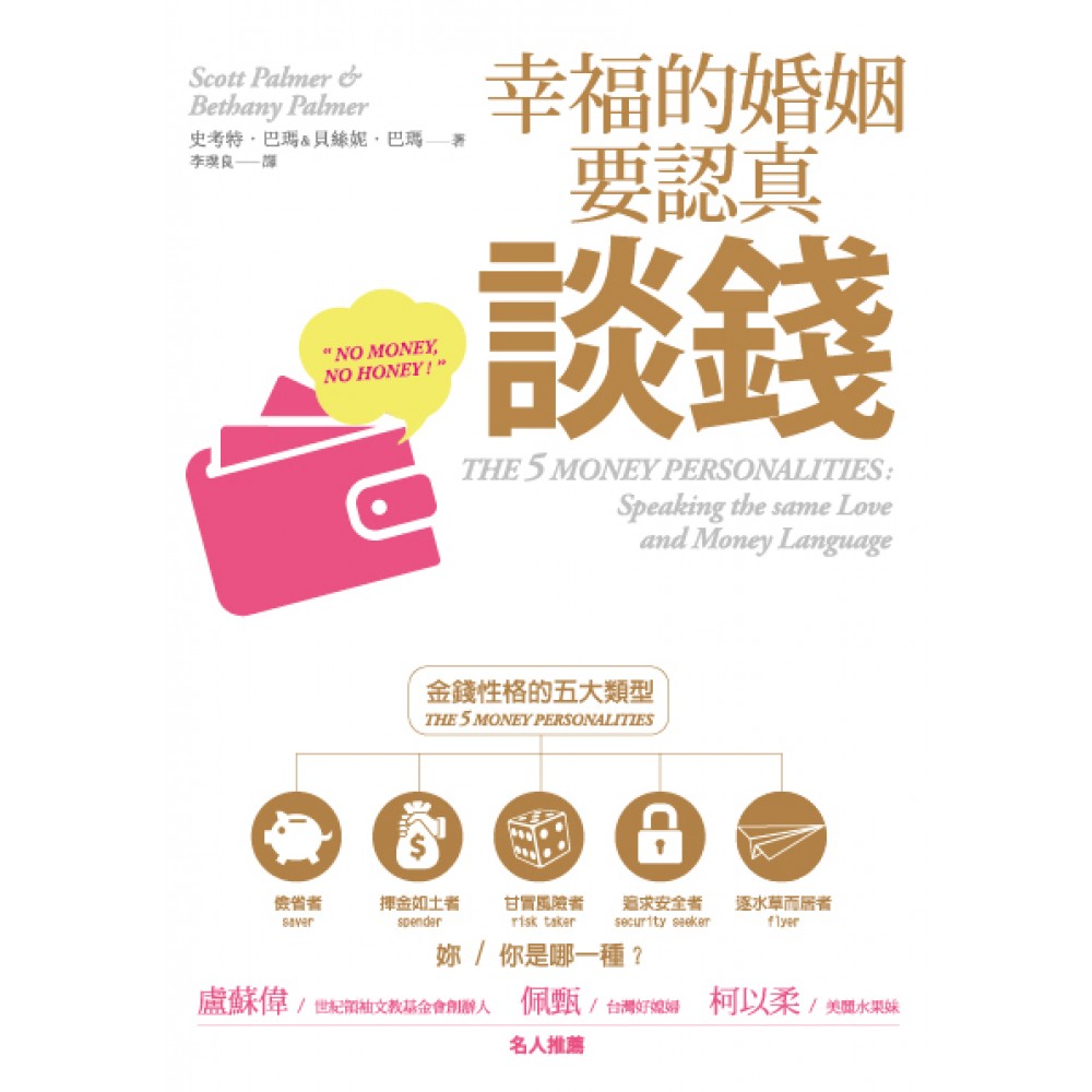 懂得談錢的婚姻才能賺到幸福! 認識五種◣金錢性格◢ 不要被錢打敗婚姻! 每對怨偶都有失敗的金錢關係~~ 失敗的金錢關係來自「金錢性格」的撞擊! 讀懂婚姻生活的金錢課,妳/你就能打造自己的幸福。 掌握五種金錢性格,是男女都應該修的一堂課。 談到夫妻相處與家庭經營,必然都會千篇一律地提到互信公開地溝通、溝通、再溝通。但是具體步驟是什麼?要如何才不至變成單方面說教?強壓對手接受自己的意志?以及劣變成批鬥大會而致使情況進一步惡化?其實,不論是高階白領還是月領22K,從各種理財規劃書、存錢術、投資密笈、時間管理,到經營夫妻關係、論愛情、如何溝通互諒等等,都沒有提到一點:如何找出婚姻生活中夫妻雙方的金錢性格。 事實上,每段婚姻從一開始就會伴隨一段「金錢關係」,每一段金錢關係都是由一套「金錢性格」(Money Personality)所構成,金錢關係就是雙方金錢觀的碰撞。 重點在於每個人的金錢觀以及處理金錢的方法都是獨一無二的,這種觀念上的差異,是因為我們每個人都有一個屬於自己的「金錢性格」,甚至有著如DNA般的深刻印記,永遠是人生的一部分,個人最核心的價值觀。金錢性格的互動,在婚姻生活中展開「金錢關係」。金錢關係並非是指個人及夫妻的財務規劃、財產安排,而是訂出這些金錢計畫的理由,也就是家庭生活中的每一項決定。金錢關係的重點在於why而非how。小至每天喝星巴克咖啡的理由、三餐內容、購物旅行,大至存錢購車買房的理由、生兒育女計畫、謀職創業等等,每一點都會因為雙方「金錢性格」的差異而有不同的行事方式。 人們的金錢觀以及處理金錢的方式,本來就大不相同,然而這點再明顯也不過的道理,多數人卻參不透,總是假定他人以及自己的另一半對金錢所抱持的態度,都和自己的一樣。有人喜歡花錢,不論是花大錢還是小錢,甚至是習於愛心樂捐,因為這樣的人樂中於享受花錢時帶來的快感。有人喜歡省錢買便宜貨折扣品,但不是因為花不起,而是為了享受cost down的樂趣,在這過程裡得到自我肯定的滿足感。有的人則是天生大腦裡就缺了錢的這個記憶體,永遠搞不清戶頭有多少錢,信用卡是否刷爆。 更常見的情況是:夫妻並非因財務困難而爭吵,而是反感於彼此的金錢配置方式。一言以蔽之,夫妻因金錢而發生爭執時,關鍵點在於彼此價值觀、目標與順序的差異。於是雙方因金錢關係而陷入誤解與指責的惡性循環,久遠前新婚時所編織的美夢,已逐漸被枯燥平凡的日常生活所取代,愛情的火花逐漸燃耗於柴米油鹽醬醋茶的瑣事。 本書作者夫妻在財務管理與婚姻諮詢上累積三十八年的經驗,帶領讀者從認識五大金錢性格出發。正視彼此的金錢性格,重新找回雙方組成家庭時的人生夢想,不再放任家庭生活中的親密關係沉淪於無盡的惡性循環。 金錢性格可以歸類為以下五種:1. 儉省者 2. 揮金如土者 3. 甘冒風險者 4. 追求安全者 5. 逐水草而居者。 奇妙的是,每個人的金錢性格都會有其中兩項,一個是主要金錢性格,另一個是次要金錢性格。可以想見,主要金錢性格與次要金錢性格要是發生衝突的話,那就是「反動力」。「反動力」可能帶來個人金錢性格上的衝突,但反動力也會有助於在衝突之中發揮互補的作用,維持決策的平衡。透過金錢性格剖面圖,找出夫妻之間的金錢性格以及隨後的應對之道,沒有哪一種金錢性格的組合是無法克服的,而是彼此是否願意重新點燃對未來的夢想。 每一對夫妻的金錢關係當然也隱藏著「金錢出軌」的可能性,而且金錢出軌幾乎存在於每一對男女關係裡。它就像婚外情一樣,萌漸於一個眼神或對話,再一步步滾成共餐、約會及上床。換言之,金錢關係的重點不是錢本身,而是溝通與信任感。金錢出軌常見的五大原因是:一、各管各的錢:源於不信任。二、過度開支和負債:無節制的花費、透支、卡債。三、缺少規劃。四、一味掌控。五、瞞著另一半處理密帳。 有了這些認識,下一步即是依循清楚簡單的步驟重新建立夫妻的金錢關係。這三大要訣分別是:「開誠布公」(Money Dump)、「密室協商」(Money Huddle),以及「吵一場好架」(Fighting Fair)。簡言之,始於徹底認識對方的底線,找出雙方金錢關係裡最大的一項缺點。繼之以根據E.N.D.的原則,針對缺點提出改進計畫,評估局勢重建信任。而後完成於吵一場好架,優質的吵架教戰手則是:急踩煞車(Stop)、拋下成見(Drop)以及捲起袖子(Roll)。 再強調一次,不管是貧賤不能移還是富貴不能淫,錢永遠都是夫妻生活的重點,夫妻的另一半也永遠都是金錢與夢想發生衝突之際的替罪羊。收入的多寡不是重點,重點在於夫妻是否能就金錢關係而展開聆聽、溝通並作出承諾。 立刻掌握自己的金錢性格:themoneycouple.com/money-personality-profile/