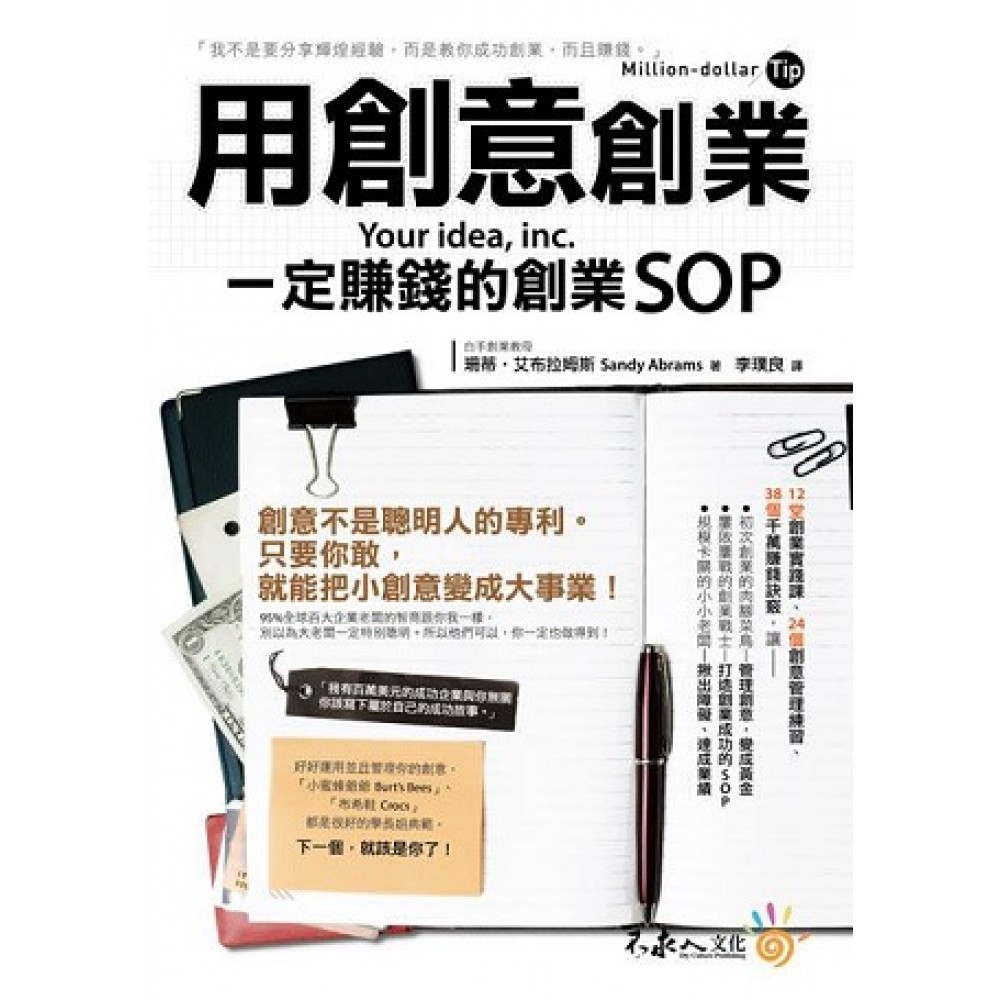 「我不只是要分享輝煌經驗,而是教你成功創業,而且賺錢!」 「我有百萬美元的成功企業與你無關,你該寫下屬於自己的成功故事!」 珊蒂.艾布拉姆斯這二句話深深影響美國數十萬創業者, 不僅成功創業,而且賺錢! 本書作者珊蒂.艾布拉姆斯今日的成功,其實只是來自於一個生理需求:一雙貼合度更完美的保濕護手套。這樣的念頭讓她從1993年在自己臥室成立的公司,現在已經是市值百萬美元的企業(Moisture Jamzz Inc.)。 你是不是也有自己獨特的想法 ~ 去創業吧!去實現它! 珊蒂.艾布拉姆斯原本是一個像你我一樣的上班族,還身兼家庭主婦,沒有商學背景、沒有顯赫學歷、沒有產業資源、沒有大筆資金到達「口袋很淺」的程度,她還是做到了,現在她要把整套創業SOP公諸於世,不是高談闊論的管理學,不是枯燥的法條、合約,而是以一套方法以及一連串的思考練習,如: .背景研究:你的「創意」真的能「創業」嗎? .掂掂口袋:創業不用很多錢,但是一定要懂得怎麼用錢 .法律保障:要鑽法律漏洞請找律師,選擇公司型態,評估專利保護 .廠商打樣:這一個階段最痛苦,但也最令人興奮,你的產品出生了! .專業形象:讓家裡的小書桌,成為別人眼裡的「執行長辦公室」 .行銷策略:只要策略對了,免費也能做行銷 .通路為王:跟通路打交道,讓他們願意陳列你的產品 創意並不是聰明人的專利。 只要你敢,就能把小創意變成大事業! 你以為創業要很多本錢?景氣不好避免冒險? 這些通通被珊蒂推翻,她要說不景氣才是創業好時機,而即使一開始公司只有你一人「校長兼撞鐘」,「執行長辦公室」就是臥室裡的小書桌,她也有很多招數讓「小書桌」看起來是一家上軌道的公司,如此大家會安心與你做生意。 .對外應對常用「我們」,營造公司多人形象 .名片不要印職稱,有時候「裝小」很好用 .申請一支消費者免付費電話,提供專業又安心的服務 .跟大公司做異業結盟,提升業界信任感,至於「小書桌」如何跟大公司合作……請見本書第240頁 「我不是要分享輝煌經驗,而是教你成功創業,而且賺錢。」 12堂創業實踐課、24個創意管理練習、38個千萬賺錢訣竅,讓: 初次創業的肉腳菜鳥—管理創意,變成黃金。 屢敗屢戰的創業戰士—打造創業成功的SOP。 規模卡關的小小老闆—揪出障礙、達成業績。 「我有百萬美元的成功企業與你無關,你該寫下屬於自己的成功故事。」 好好運用並且管理你的創意,「小蜜蜂爺爺(Burt’s Bees)」、「布希鞋」(Crocs)都是很好的學長姐典範,下一個,就該是你了! 「我不只是要分享輝煌經驗,而是教你成功創業,而且賺錢!」 「我有百萬美元的成功企業與你無關,你該寫下屬於自己的成功故事!」 珊蒂.艾布拉姆斯這二句話深深影響美國數十萬創業者, 不僅成功創業,而且賺錢! 本書作者珊蒂.艾布拉姆斯今日的成功,其實只是來自於一個生理需求:一雙貼合度更完美的保濕護手套。這樣的念頭讓她從1993年在自己臥室成立的公司,現在已經是市值百萬美元的企業(Moisture Jamzz Inc.)。 你是不是也有自己獨特的想法 ~ 去創業吧!去實現它! 珊蒂.艾布拉姆斯原本是一個像你我一樣的上班族,還身兼家庭主婦,沒有商學背景、沒有顯赫學歷、沒有產業資源、沒有大筆資金到達「口袋很淺」的程度,她還是做到了,現在她要把整套創業SOP公諸於世,不是高談闊論的管理學,不是枯燥的法條、合約,而是以一套方法以及一連串的思考練習,如: .背景研究:你的「創意」真的能「創業」嗎? .掂掂口袋:創業不用很多錢,但是一定要懂得怎麼用錢 .法律保障:要鑽法律漏洞請找律師,選擇公司型態,評估專利保護 .廠商打樣:這一個階段最痛苦,但也最令人興奮,你的產品出生了! .專業形象:讓家裡的小書桌,成為別人眼裡的「執行長辦公室」 .行銷策略:只要策略對了,免費也能做行銷 .通路為王:跟通路打交道,讓他們願意陳列你的產品 創意並不是聰明人的專利。 只要你敢,就能把小創意變成大事業! 你以為創業要很多本錢?景氣不好避免冒險? 這些通通被珊蒂推翻,她要說不景氣才是創業好時機,而即使一開始公司只有你一人「校長兼撞鐘」,「執行長辦公室」就是臥室裡的小書桌,她也有很多招數讓「小書桌」看起來是一家上軌道的公司,如此大家會安心與你做生意。 .對外應對常用「我們」,營造公司多人形象 .名片不要印職稱,有時候「裝小」很好用 .申請一支消費者免付費電話,提供專業又安心的服務 .跟大公司做異業結盟,提升業界信任感,至於「小書桌」如何跟大公司合作……請見本書第240頁 「我不是要分享輝煌經驗,而是教你成功創業,而且賺錢。」 12堂創業實踐課、24個創意管理練習、38個千萬賺錢訣竅,讓: 初次創業的肉腳菜鳥—管理創意,變成黃金。 屢敗屢戰的創業戰士—打造創業成功的SOP。 規模卡關的小小老闆—揪出障礙、達成業績。 「我有百萬美元的成功企業與你無關,你該寫下屬於自己的成功故事。」 好好運用並且管理你的創意,「小蜜蜂爺爺(Burt’s Bees)」、「布希鞋」(Crocs)都是很好的學長姐典範,下一個,就該是你了! 「我不只是要分享輝煌經驗,而是教你成功創業,而且賺錢!」 「我有百萬美元的成功企業與你無關,你該寫下屬於自己的成功故事!」 珊蒂.艾布拉姆斯這二句話深深影響美國數十萬創業者, 不僅成功創業,而且賺錢! 本書作者珊蒂.艾布拉姆斯今日的成功,其實只是來自於一個生理