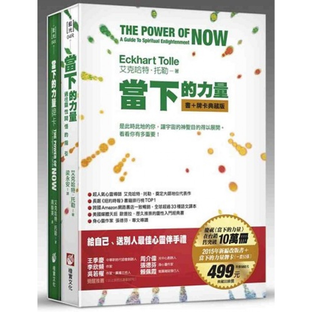 歡慶《當下的力量》在台銷售突破10萬冊! 隆重推出【當下的力量典藏版】 全新改版書+當下的力量牌卡(一套50張) 瓦解痛苦之身、超越心智束縛的絕配組合 給自己、送別人的最佳心靈伴手禮! 似乎沒人知道,人之所以活在這世上 就是為了要經歷一場深沉的內在轉化歷程 是此時此地的你,讓宇宙的神聖目的得以開展。 看看你有多重要! 超人氣心靈導師 艾克哈特.托勒,奠定大師地位代表作 長踞《紐約時報》書籍排行榜TOP1,跨國Amazon網路書店一致暢銷,全球超過33種語文譯本 美國媒體天后歐普拉,歷久推崇的靈性入門經典書 身心靈作家張德芬,專文導讀推薦 你常感到壓力很大嗎?你是否總在忙著追逐未來,讓當下淪為達成未來目標的手段?壓力來自於你身在「這裡」,心卻想要去到「那裡」;身在現在,心卻想要去到未來。如此一來,你和你的內在將分裂開來,而在這種分裂狀態中生活是錯亂又瘋狂的。 無論身處何方,請全然安住。如果你覺得「此時此地」讓你無法忍受,讓你覺得不快樂,那你有三種選擇:離開它、改變它,或接納它。如果你想為自己的人生負責,務必擇一而行,而且要在當下做出抉擇。然後,接受選擇所帶來的結果──沒有任何藉口,不帶負面情緒,毫無心智汙染,保持你內在空間的純淨。 往往,採取任何行動都會比什麼也不做來得好──若你久困於一個不快樂的處境,那就更該如此。即便行動失敗,仍可從失敗中學習。如果什麼也不做,那就什麼也學不到。不採取行動是因為恐懼嗎?如果是,那就承認、觀察、專注於那份恐懼,全然臨在時也帶著它,這將會斬斷恐懼與你思維之間的連結。不要讓恐懼升起並進入你的心智當中,利用當下的力量,這樣恐懼就無法得勝。 【全新改版書特色】 加入托勒原文書中特有的「太極符號」,內文由直書改為橫書:為了回歸英文版的設計精神,新版書使用作者獨家設計的「太極符號」,以體現出其教導的神髓:注重文字與文字、聲音與聲音之間的「停頓」、「間隙」。唯有停下來回到「空」中,才能取用源源不絕當下的力量。 全文新編校訂,譯詞統一整合:為方便讀者在閱讀及學習上的一體適用,托勒較常使用的專有名詞,如:靜觀寂照、普通無意識、深層無意識等等,皆參照他的其他著作,如《當下的覺醒》、《操練當下的力量》、《一個新世界》等,進行橫向連結的彙整修訂。