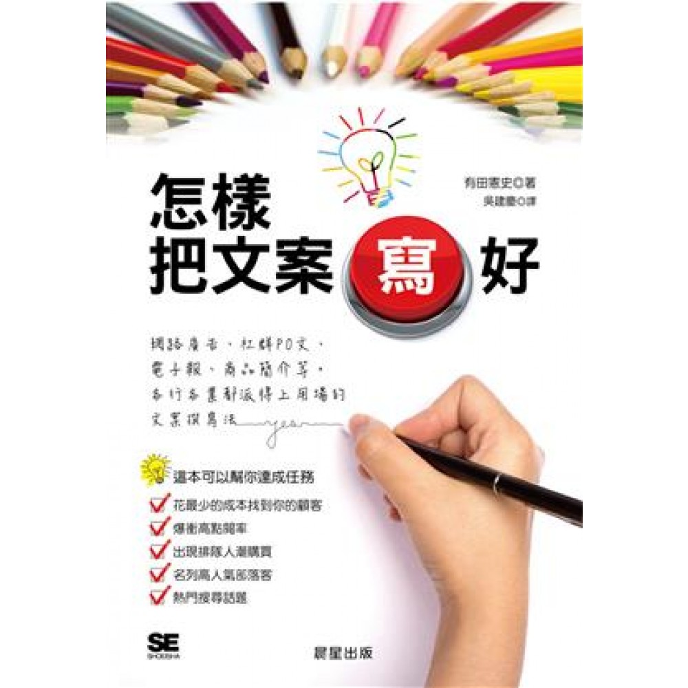 網路廣告、社群PO文、電子報、商品簡介等,各行各業都派得上用場的文案撰寫法 文案行銷術SOP 照著做,就算寫出平凡的句子也能打動人心 網路文章「不會仔細看」是理所當然的事 就算讀者只是大略瀏覽,也能將訊息傳達給他們 那文案該怎麼寫,可以一開頭瞬間引起注意呢? 本書為您整理出專門針對不同業種、商品的訴求方式, 詳盡說明可以應用在網路廣告、社群網站、電子報、新聞稿、商品企畫、公司簡介等,及各行各業都派得上用場的文案撰寫方法。 或者是當你在寫文章時遇到「沒有靈感」,或者「寫是寫了,好像少點什麼」時,可以拿來應用的文案急救箱。 由現職的文案作家透過實例為您解說簡單就能實踐的知識技能-- --第1章 學會寫文案最基本的4個原則。 --第2章 根據目的有很多種發想法,介紹給你最實用的。 --第3章 寫得好,再長還是有人想看、完全不覺得煩的寫法。 --第4章 吸引顧客「我想要買!」的文案是什麼?本章可以磨練出你的完美表達力 --第5章 自覺寫得行雲流水,也一樣會出錯,8個品管重點幫你提升品質。 --第6章 了解顧客的閱讀行為模式,引導你寫出「好記、會讓人想買想看」的文章。 用對方法,人人都是創意奇才 就算你是初學者也能馬上寫出漂亮的文案!! 而且還能讓顧客主動找到你。 本書特色 (1) 各行各業都派得上用場,教你寫出好文案找到顧客,成為熱門搜尋話題。 (2) 介紹標語發想的5個步驟、分析24種文案寫法並歸納出原則,初學者也能立刻上手。 (3) 帶領讀者認識網路閱讀方式和一般閱讀書籍方式是如何的不同,清楚好懂的說明,讓讀者願意看並理解傳達訊息的寫法。