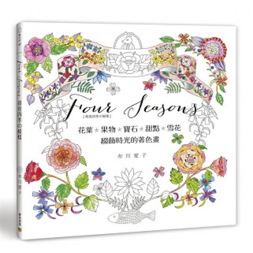 序 歡迎來到充滿可愛小物、Four Seasons──四季的著色畫世界。 經過春天、夏天、秋天到冬天, 隨著翻閱著色本的頁面,四季也慢慢地轉變。 將各個季節漂亮的花和葉、寶石或緞帶等等的構圖鑲嵌在書中。 隨時能自由地從自己喜歡的頁數開始,並使用所喜歡的顏色來塗繪。 這麼一來,這黑白單色的世界,便會變換為繽紛熱鬧的彩色世界! 「橡實是咖啡色的」等,不需要依照實際物品的顏色來著色。 就當成是在創作自己的作品,無需客氣地大膽塗上自己喜歡的顏色吧! 上色完畢後,呈現出來的將會是這世界上獨一無二的作品。 由於使用的是適合上色的紙張,不管是使用色鉛筆、蠟筆、彩色原子筆、水性筆或是水彩都能著色。 不過,使用水性筆或水彩上色時,不要一直不斷地重複上色喔! 若重複上色太多次,不管多好的畫紙都沒辦法防止顏料往下滲透。 在本書的最後,插入了透明描圖紙著色的上色畫, 這是,若下方的畫也上色後,將兩張圖案重疊,透過描圖紙, 便會呈現出有如幻想世界般的著色畫! 那麼,現在就準備好喜歡的畫具,春夏秋冬,開始塗繪四個季節的世界吧!