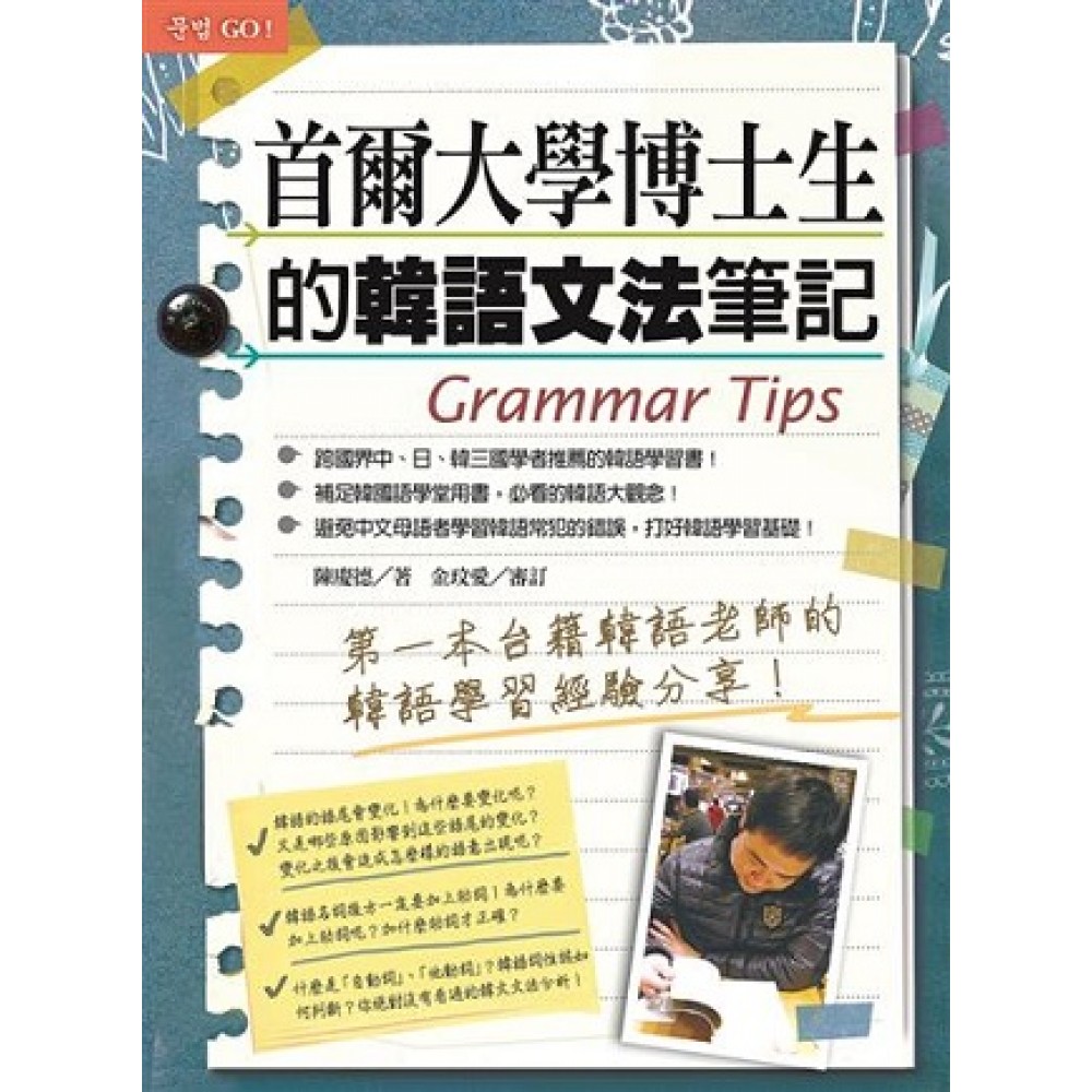 第一本台籍韓語老師的韓語學習經驗分享 首爾大學博士生韓語學習經驗傳承大公開 第一本由學習者角度提問、幫助徹底理解的觀念書 有別於硬梆梆、死板專有名詞堆砌的文法書 提示華人在韓語學習中常犯的錯誤,避免學習偏誤 補足韓國語學堂用書,必讀的韓語大觀念 對比熟悉的中文、英文,來講解韓語語系,深入語言分析 貫通韓語文法、打好韓語根基 韓語的語尾會變化!為什麼要變化?哪些原因會影響語尾的變化?變化之後又會造成什麼樣的語意? 韓語名詞後方一定要加上助詞!為什麼要加上助詞?加什麼助詞才正確? 韓語的時態要如何才能正確把握? 什麼是「自動詞」、「他動詞」?韓語詞性又該如何判斷? 你從來沒有看過的韓語文法分析! 最實用!台灣首本由台籍韓語老師、香港七所大韓韓國語專門學校指定教材編著者—陳慶德老師寫作分享的韓語學習經驗談。 最重要!提醒中文母語者在學習韓語常犯的錯誤,掌握基本的韓語學習大觀念,打好學習韓語的基礎。 最特別!對比語言學分析:引用中文、英文講解韓語語系,利用基礎英文文法、簡潔的中文解釋,讓您更加瞭解學習拼音文字韓語的奧妙。 最受歡迎!兩岸三地超過十萬讀者見證、跨國界中、日、韓三國學者推薦的韓國語學習書,以及國內跨領域大學體系推薦-必備、必看的韓語學習大觀念入門工具書。 最輕鬆!擺脫嚴肅的「專有名詞」堆砌,透過大量句型舉例、說明解釋,不再只是硬梆梆死背韓語文法,透過提問及理解,輕鬆學習韓語。 南韓全州大學李寶英、日本新羅大學宮城佳奈教授、日本中央大學近藤剛教授、台灣嘉義大學鄒美蘭老師、台灣嘉義大學王永一教授、台灣高雄第一科技大學孫思源教授,跨國傾力推薦!