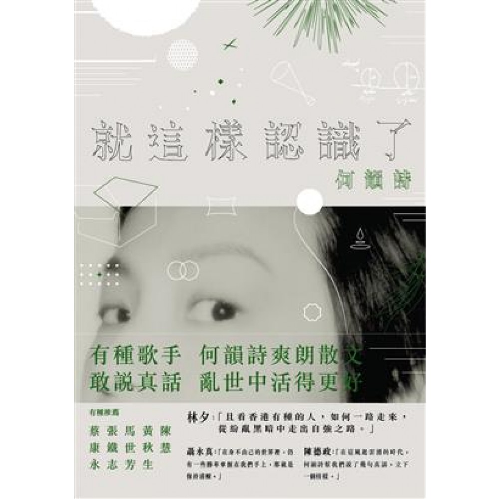 去年八月,社會氣氛不算風平浪靜,但那歷史性巨浪還沒翻起。記得九月二十二號那個禮拜,我還寫了一篇叫《我的簡約生活(上)》的文,當時怎麼也沒想到,過不了幾天,我們熟悉的街道上,竟然出現那個如斯震撼的畫面。香港年輕人道路從此改寫,我的方向也從此出現重大轉變,生活從此不簡約。現在,決定將這些文字結集成書,永恆地記錄在文本上,書名為《就這樣認識了》。 翻看著快一年的文字和感想,才明白,接下這個任務最終做到的,竟是讓我能規律地將我每周看見的清楚記下。這些文字記錄剛好出現在香港,還有我本人,轉變最大的一年。不管是緣份是巧合,總算是承載著這一個轉折點上,從我眼中所看見,從我身體切實感受到的,這個地方在這一年濃縮起來的喜怒哀樂。 或許,所有的衝擊都是一個契機,讓我們重新發現自己,重新接上我們的根。這書,就像是我跟這個家重新接上後的一份見面禮。 Nice to finally meet you all,我的名字是何韻詩。 何韻詩的迷人之處,源自她身上一股開天闢地的「有種」氣魄。她既是歌手也是行動者,在香港雨傘運動時期,選擇爬上浪尖與現實對話。本書收入何韻詩在那段抗爭日子,於香港蘋果日報連載年餘的「詩與胡說」專欄,三十多篇生活隨筆、歌手自白、社區紀錄、未來發想,亦見證了她與城市的關係、對生活本質的尋求,以及艱難年代下,自身與時局的雜感。這書忠實記錄了她如何重新發現自己,決心放下主流資源,一步跨上獨立歌手的有種之路。 如今時勢,台灣與香港有著愈來愈緊密的鏡像對應,同樣的躁動與抵禦,人們同樣愛著自己的土地,並相信可有不一樣的未來。《就這樣認識了》誠懇真實,能量透紙撲面而來,供給勇氣,讓一切重新開始。認識香港,認識何韻詩,也許就是另一種認識自己。