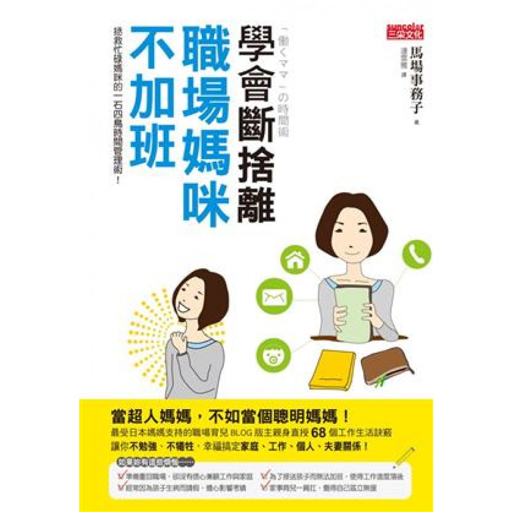 前言 原來有些事不做也沒關係! 第一章 讓媽咪準時下班的工作術 1 懂得請求協助,準時下班非難事! 2 避免手忙腳亂,讓對方主動遵守「約定期限」 3 免被上司拖累工作的「預備」應對法 4 浪費時間的盲點就是「等待的時間」 5 巧妙回絕別人交付的工作 6 與上司、同事建立信賴關係 7 當個人見人愛的職場媽咪 8 列出失誤排行榜 9 避免陷入失誤循環的自信恢復法 10 孩子生病時採取「家中指揮塔作戰」 11 善用「病兒保育服務」 第二章 積極找出「不做的事」,學會「斷捨離」 12 積極找出「不做的事」 13 產假期間已省略的工作就別再做了 14 省略不必要的麻煩 15 可自動化處理或認真做也沒有回饋的工作就別做了 16 送交政府機關等單位的文件,只要一通電話就能完成 17 設定「工作保養日」 18 「被動」與「保留」能減少不必要的工作 第三章 設定「自我時間」,在育兒過程中持續成長進步 19 越是焦慮不安,越無法提升技能 20 忙碌媽咪提升技能請「從小事開始」 21 陪孩子一起學才藝,培養新興趣 22 透過「身」「心」保養,隨時放鬆 23 利用午休磨練自我 24 搭車時嘗試平常不做的「小事」 25 一個月參加一次研習會,不如每年自己辦一次讀書會 26 擔任學校的活動委員,邀請自己希望的講師 27 利用午餐取代下班後的聚餐 28 事關將來的「邀約婉拒法」 29 結交「非鄰居的家長朋友」 30 妳心目中的「理想媽媽」決定「與孩子的相處時間 31 從「自己想做的事」轉換成「和孩子一起想做的事」 32 適度參與孩子的活動 33 讓孩子學習才藝前請先確認孩子的意願 34 棘手的家事不妨花錢解決 第四章 聰明媽咪的時間與情報管理術 35 適合職場媽咪的「游牧上班族」 36 利用「Gmail」在家或搭車也能收發郵件 37 午休時間利用「Dropbox」製作PTA的資料 38 與其用「時間」不如用「工作」管理行程 39 待辦事項依「場所」分類,省去重複做的麻煩 40 規劃行程最重要的是決定「不做的事」 41 利用手帳確保「個人時間」 42 了解「另一半規劃行程的方式」,讓相處更融洽 43 準備一本可以隨便寫的便條本 44 幸福日記,感受當下幸福、增加自信 45 善用手機應用程式,孩子就醫時特別有幫助 46 讓孩子開心的遊戲應用程式 47 嘗試寫網路育兒日記 48 消除育兒中無法與人互動的空窗期 第五章 讓爸爸成為好幫手,個人時間就能大幅增加 49 付出體貼與用心,改變另一半的想法 50 如果另一半比較遲鈍,請「具體」提出要求 51 對另一半的失誤偶爾睜一隻眼、閉一隻眼 52 避免成為「老媽子」的「爸爸回家」魔法 53 透過「一日保母」讓另一半了解育兒的辛苦 54 讓爸爸也能輕鬆帶孩子去看病的「就醫備忘錄」 55 讓爸爸參與孩子學校的活動,成為育兒的好幫手 第六章 無可避免的家長交流時間 56 與媽媽朋友建立互相幫助的良好關係 57 遇到不想往來的人,以「忙碌」為由脫身 58 參加家長教師會是擴展視野的絕佳機會 59 主動聲明「哪些事做得到,哪些事做不到」 60 有意義地度過冗長的「會議」 61 「敦親睦鄰」讓妳在緊要關頭獲得幫助 第七章 就算不順利,也不是妳的錯! 62 千萬不要有「一定要成為無可取代的人」的焦慮 63 抑制內心不安的方法 64 能夠又工作又育兒,一半是靠「運氣」 65 如果你有「因為有了孩子,所以無法繼續工作」的想法 66 即便離職,還是可以創造經歷 67 辭職後的「工作空轉法」 68 充滿煩惱的當下,正是盤點人生的絕佳機會 結語 與孩子、另一半分享妳的幸福!