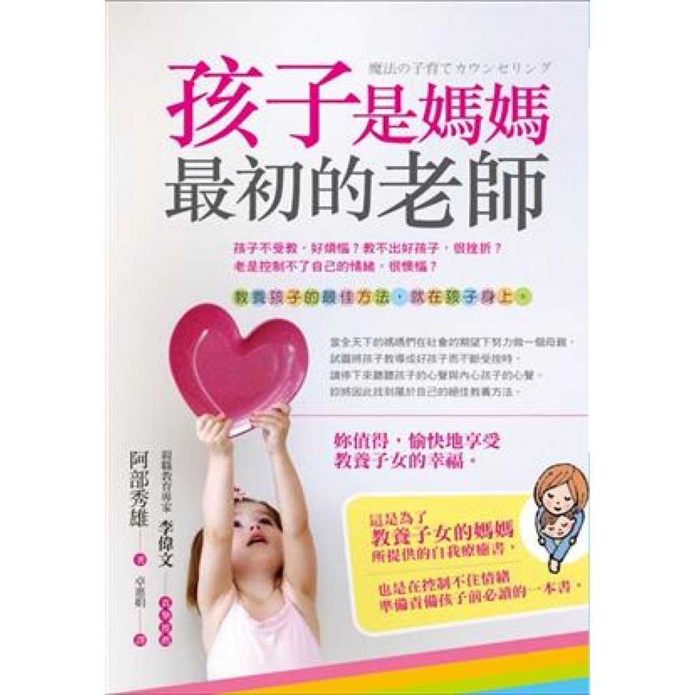 孩子不受教,好煩惱? 教不出好孩子,很挫折? 老是控制不了自己的情緒,很懊惱? 教養孩子的最佳方法,就在孩子身上。 當全天下的媽媽們在社會的期望下努力做一個母親,試圖將孩子教導成好孩子而不斷受挫時,請停下來聽聽孩子的心聲與內心孩子的心聲。妳將因此找到屬於自己的絕佳教養方法。妳值得,愉快地享受教養子女的幸福。 這是為了教養子女的媽媽所提供的自我療癒書,也是在控制不住情緒準備責備孩子前必讀的一本書。 在現今的生活中,變化愈顯激烈,教養子女方也愈顯困難。在不知所措的激變瞬間,當我們追趕不及變化的腳步時,父母很容易就會陷入教養的泥沼中而失去自信。 讓阿部秀雄為您揭開孩子表面行為中所隱藏的真相: 為什麼老是動不動就會對孩子發火? 父母的心煩氣躁其實其來有自,那可能是因為自身在童年時期未被充分滿足的內在小孩在哭泣。 為什麼小孩就是會調皮搗蛋? 孩子的胡鬧其實有跡可尋,他的行為可能正反映出父母不安的情緒或是源於對父母的擔心。 為什麼明明知道不應該卻還是會遷怒孩子? 因為無法譴責讓負面情緒失控的自己,因此就會在痛苦時不知不覺遷怒親近的人。 為什麼孩子會不想去上學? 孩子不見得是討厭去學校,他的反抗可能是因為感受到父母同樣不想去上班或低落的情緒而做出的表現。 只要父母能充分疼愛自己,內在孩子得到疼愛,潛藏在內心深處的「成人心」便會因而甦醒,您將能寬容地對待周遭的一切並看透孩子頑皮背後的真相。請記住,媽媽幸福,孩子才會幸福。妳有權力先讓自己得到幸福!