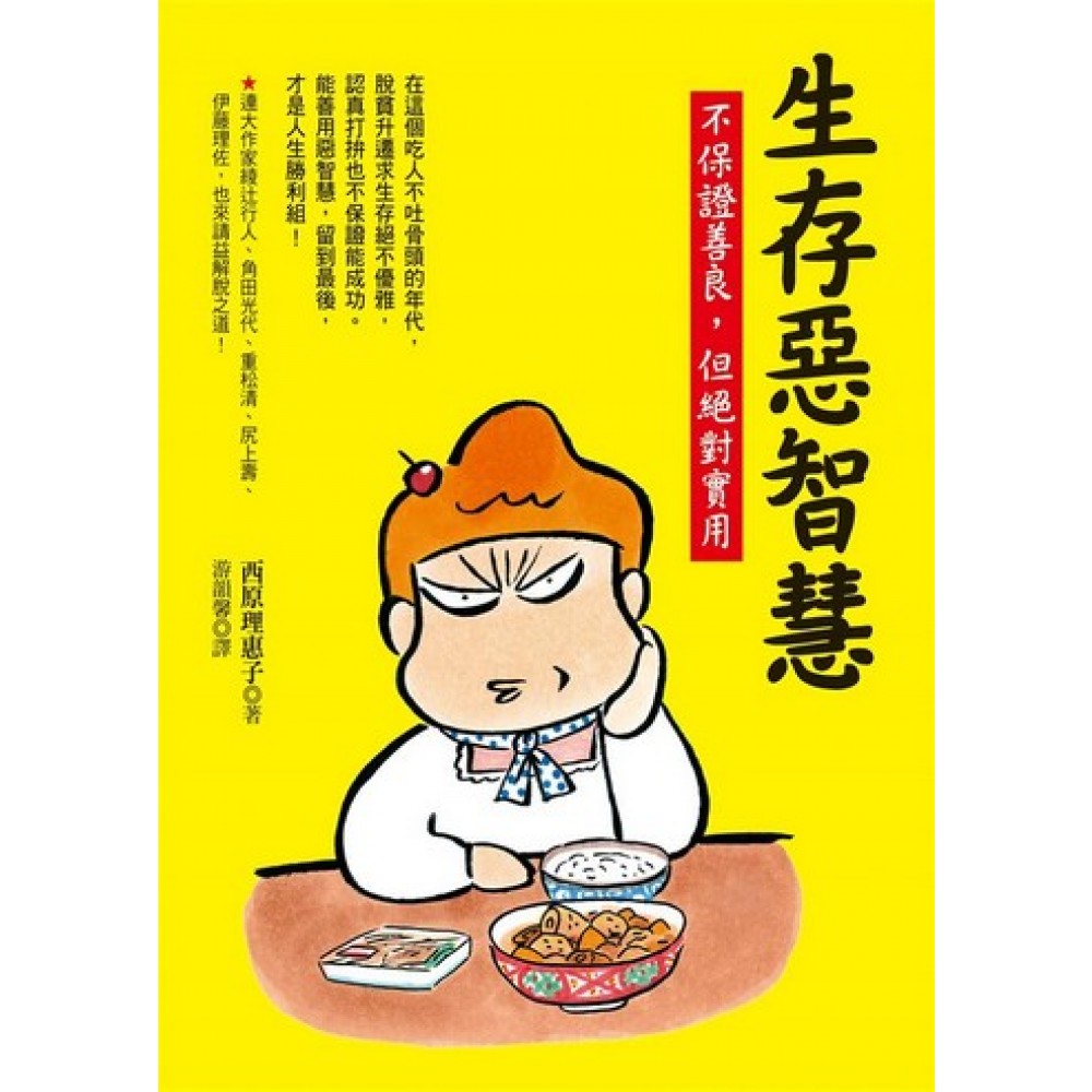 人生比八點檔還精采的西原理惠子,為你點破江湖險惡,提供痛快的心靈處方箋! 連大作家綾辻行人、角田光代、重松清、尻上壽、伊藤理佐,也來請益解脫之道! 在這個吃人不吐骨頭的年代,脫貧升遷求生存絕不優雅,認真打拚也不保證能成功。 拋開自尊,每天開心有飯吃最重要!能善用惡智慧,留到最後,才是人生勝利組! 就「金錢」「兩性關係」「工作」「家庭」「個性問題」等60種煩惱,傳授絕對管用的處世之道。 【兩性關係】 ‧男/女朋友遲遲不想結婚,該如何讓他萌生結婚念頭? →那就別結啊!結婚不是「讓某人想做」的事情喔。夫妻是戰友,想結婚一定要兩人都心甘情願。在漫長的人生裡,總有遇到暴風雨時,你一定要有能力也甘願不離不棄的握住對方的手。請先仔細思考,為什麼要結婚? 【工作】 ‧好不容易找到工作,卻是血汗公司。才做不滿一年,該辭職嗎? →不滿一年就辭職並沒有對不起誰。你現在就跟受暴婦女要與施暴老公離婚時一樣,還沒辦法下定決心。時間緊迫,最好在遍體鱗傷前做出決斷! 【家庭】 ‧婆婆一直要我生小孩,壓力好大! →要婆婆不干預生小孩,就像要太陽打從西邊出來一樣不可能。工作太累時,聽到婆婆催生小孩,的確會很火。不如明快一點,現在就決定到底要不要生小孩,避免失去理智喔! 【個性問題】 ‧我是個大路痴,有什麼方法可以改善嗎? →現在已經有汽車導航,認不得路也沒什麼大不了的,有些人雖然看不懂地圖,卻能清楚感受到人際之間細微的氣氛消長。人生就是有捨有得,我認為懂得察言觀色才是最重要的資產。 看西原理惠子以豪爽與幽默,讓你從辛酸人生中獲得智慧,並且……笑到噴淚! 這些瑣碎的煩惱總是在你我的心裡千迴百轉~ ˙一流科系畢業,面試了70家公司,沒有一家錄取 ˙薪水低得根本結不了婚,要換工作嗎 ˙同事老是借錢不還,怎麼拒絕他 ˙52歲的老公說要辭職,去鄉下賣麵 ˙主管每天找我去喝酒,很煎熬 ˙公司突然要考托益,但是我英文很爛 ˙同事藉口要回家帶小孩,把工作丟給我 ˙結婚五年,老婆越來越胖 ˙正妹女朋友的那裡很臭 ˙超過30歲,沒交過女朋友,好想馬上脫處 ˙要怎麼跟70歲老爸說,請他及早分配財產避稅 ˙婆婆一直催我們生孩子 ˙好丟臉,人過50歲變得愛哭,看《巨乳排球》也飆淚 ˙高中兒子是個蘿莉控 ˙一想到地震、核輻射就心情沮喪 ˙男朋友遲遲不跟我求婚 ˙60多歲老爸為了取悅小女友,身體變差了 ˙受不了隔壁陽台傳來的菸味 ˙別家的狗老是在我家門前大便 ˙老師太親切,很煩 ˙開心搬新家,隔壁卻住了噪音阿桑…… 克服生活挑戰必備,強心壯膽大補帖!西原經典語錄── ˙堅持正確的事情並不保證能讓你活下去。 ˙太過認真,會活得很痛苦。 ˙想要安定就必須跟惡魔打交道,千萬不要搞錯順序。 ˙不要將吃苦耐勞的能力用錯地方。 ˙大門走不通,就走旁門左道吧! ˙「只要隱忍,事情就會過去」這跟說謊沒兩樣。 ˙出去賺錢、被老闆或顧客罵,是很寶貴的人生經驗。 ˙主管是自己一輩子的情人或戰友。 ˙尊嚴、自尊沒辦法填飽肚子。 ˙既然麻煩事已經找上,就一定要扭轉現況。 ˙既然是你要別人做的事,就不要抱怨。 ˙不要落入制式的想法,試著找出其他方法吧! ˙討厭的公司裡只會有討厭的人。 ˙有空抱怨公司,不如去想怎麼做才能樂在工作吧! ˙將自己推向絕境,你才能真正學會拒絕。 ˙每天做一些無傷大雅的惡作劇,減弱對方氣勢。 ˙因為把對方當人看,才會這麼生氣。 ˙說謊是最方便的解決之道。 ˙繼續活在負面情緒裡,總有一天你會開始討厭自己。 ˙在家裡堆東西就等於是將錢花在垃圾上。 ˙在湧現不耐煩的情緒前轉個彎很重要。 ˙「不要浪費」的想法真的很重要。