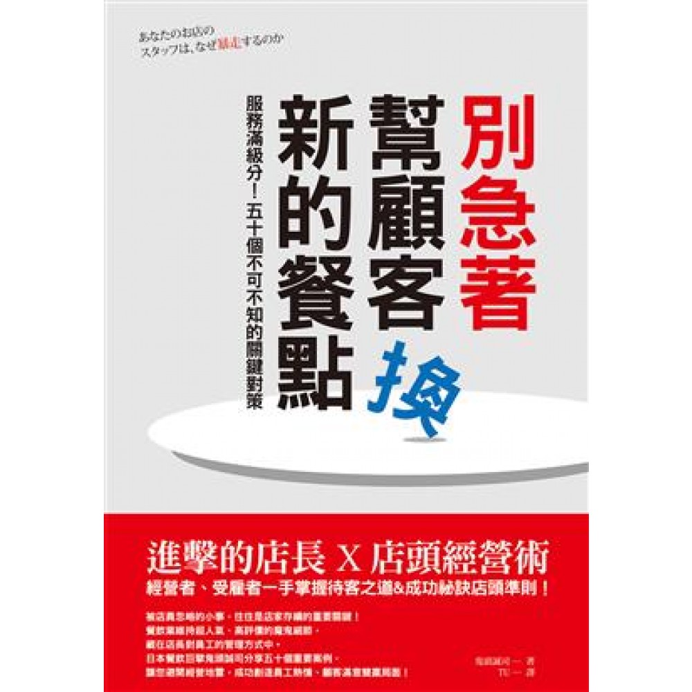 進擊的店長X店頭經營術 經營者、受雇者一手掌握待客之道&成功祕訣店頭準則! 被店員忽略的小事,往往是店家存續的重要關鍵! 餐飲業維持超人氣、高評價的魔鬼細節, 藏在店長對員工的管理方式中。 日本餐飲巨擘鬼頭誠司分享五十個重要案例, 讓你避開經營地雷,成功創造員工熱情、顧客滿意雙贏局面! 日本餐飲巨擘鬼頭誠司開創二十家居酒屋連鎖企業,年營業額超過二十億元,餐飲業的生存及成功祕訣在哪裡?本書公開經驗分享鬼頭誠司進入餐飲界從第一家店做起,十二年間所累積的第一手觀察與經驗。 ◆掌握魔鬼細節,員工不暴走 以客為尊的服務業,如何在全民狗仔的網路世代,出色的經營與生存?別讓員工一時的玩笑、嬉鬧,帶來店家生存的危機。員工無心的PO照;不經意的動作、言語,以及不自覺的態度,都可能帶來顧客強烈反彈、撻伐,負面評價如烈火在網路延燒。 面對奧客無理,員工暴走狀況連連,店長要從千頭萬緒中找出方法,擺平外在與內部的衝突,就必須掌握管理重點,一一進擊。 ◆遇到這種狀況,你會如何處理? *店員嬉鬧的照片Po上網路 *麵條產地明明是東京,卻標示成「讚歧烏龍麵」 *顧客無法感受店員的活力及笑容 *不小心打翻盤子,弄髒顧客衣服 *點菜與結帳的客人同時出聲 *放在更衣室皮包裡的錢被偷了 ◆創造員工士氣與顧客滿意雙贏局面 問題究竟出在哪裡?找出答案前,別急著幫顧客換新的餐點,你可以有更面面俱到的方法,招呼顧客滿意消費,也能激發店員工作熱情,在顧客至上的氛圍中,成功營造賓主盡歡的雙贏局面。本書所提供的管理細節檢測問卷與表單,更是你進行內部管理的絕佳幫手。 本書分享讓員工不暴走,店家獲得高人氣、高評價的經營祕訣。全書集結了五十個精采案例,歸納出多種積極面對問題的方法,一一擊破餐飲從業人員盲點。身為店長的你,必須聰明避開網路延燒、偽造標示、服務糾紛的地雷,才能真正掌握成功關鍵,締造長紅業績! 本書特色 1. 學會本書五十個經典案例,你也可以處理員工突如其來的問題,有效防止員工暴走,避免大小狀況不斷。 2. 囊括店家經營多種面向,針對問題一一解決,啟動店長「預防式的管理機制」,拒絕員工無心的失誤造成店家的傷害。 3. 書末附贈員工暴走程度表、為員工及店長量身訂做的確認表。