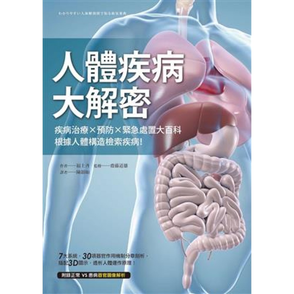.第1章 頭部 .1頭顱與腦部 .一窺頭顱和腦部構造的樣貌! .COLUMN 腦部的85%是由水分所構成 .COLUMN 舊腦和新腦 .腦的各個部分有什麼樣的功能呢? .訊息是如何在腦中傳遞的? .COLUMN 憂鬱症患者體內減少的血清素 .若出現以下症狀(頭部) .腦部疾病 .2眼 .眼睛是什麼樣的器官? .COLUMN 淚液可持續滋潤眼睛表面 .我們是如何看見事物的? .COLUMN 藍色眼睛與褐色眼睛 .若出現以下症狀(眼) .眼部疾病 .3耳 .一窺耳內構造的樣貌! .COLUMN 半規管水腫的梅尼爾氏症 .我們是如何聽見聲音的? .若出現以下症狀(耳) .耳部疾病 .COLUMN 聽力會隨著年齡增加而退化 .COLUMN 容易被誤診為梅尼爾氏症的疾病 .COLUMN 建議的就醫方式 .4鼻 .鼻子內部不單單只是一個空洞!? .COLUMN 過敏是引起花粉症的元凶 .嗅聞氣味的構造 .若出現以下症狀(鼻) .鼻部疾病 .COLUMN 以香味療癒身心的芳香療法 .COLUMN 血液檢查和生活習慣病 血糖值和糖化血紅素A1c .5口 .一窺口部構造的樣貌! .COLUMN 口輪匝肌萎縮使口腔成為細菌的溫床 .為什麼牙齒有各種不同的形狀? .COLUMN 植牙和真的牙齒一樣嗎? .為什麼舌頭可以分辨味道? .什麼時候會分泌唾液? .COLUMN 飯後牙垢中的酸性度會增加 .若出現以下症狀(口腔與牙齒) .口腔與舌部疾病 .COLUMN 腦部進行綜合性的判斷以產生味覺 .COLUMN 蛀牙是從內部逐漸擴大 .牙齒疾病 .COLUMN 血液檢查和生活習慣病 血脂異常症和膽固醇、中性脂肪 .6喉嚨 .喉嚨是如何將空氣和食物分開的? .COLUMN 常見於高齡者的吸入性肺炎 .為什麼食物不會進入肺部 .若出現以下症狀(喉嚨) .喉部疾病 .COLUMN 聲音的高低由聲帶振動的次數而定 .COLUMN 打呼有可能嚴重到破壞夫妻關係嗎!? .第2章 胸部 .1胸部內的臟器 .肺和心臟的位置 .COLUMN 做健康操時使用的是腹式呼吸 .若出現以下症狀(胸部) .2肺 .一窺肺臟構造的樣貌! .肺部疾病 .COLUMN 戒煙的方法有哪些? .3心臟 .心臟是什麼形狀!? .COLUMN 調整心臟搏動速度的自律神經 .心臟疾病 .COLUMN 血液檢查和生活習慣病 尿酸值與痛風 .第3章 腹部 .1腹部內的臟器 .肚子裡有什麼東西!? .食物是怎麼被消化的? .COLUMN 「焦慮會影響消化」是真的嗎? .COLUMN 幽門螺旋桿菌與胃部疾病 .若出現以下症狀(上腹部) .胃和十二指腸疾病 .2小腸、大腸、肛門 .食物在胃中消化後,如何形成糞便? .若出現以下症狀(下腹部) .小腸、大腸、肛門疾病 .3肝臟 .一窺肝臟的構造! .肝臟如何執行代謝作用? .肝臟疾病 .COLUMN 肝臟肥大的脂肪肝 .4膽囊 .膽囊是什麼!? .COLUMN 膽囊是可有可無的器官嗎? .5胰臟 .胰臟有什麼功能? .膽囊和胰臟疾病 .6泌尿器官 .泌尿器官是指哪裡的構造? .COLUMN 腎臟病患者的飲食 .腎臟有什麼功能? .7膀胱 .一窺膀胱構造的樣貌! .COLUMN 人工透析和腎臟移植 .若出現以下症狀(泌尿器官) .腎臟疾病 .尿路和膀胱疾病 .COLUMN 利用血液檢查早期發現前列腺癌 第4章 生殖器 .1男性生殖器 .一窺男性生殖器構造的樣貌! .COLUMN 勃起功能障礙的治療在日本可獲得保險給付 .射精的機制是什麼? .COLUMN 男性也會發生更年期障礙 .若出現以下症狀(男性生殖器) .男性生殖器疾病 .2 女性生殖器 .一窺女性生殖器構造的樣貌! .受精之前的過程 .若出現以下症狀(女性生殖器) .女性生殖器疾病 .懷孕期間的疾病 .COLUMN 不投藥的無痛分娩 .3乳房 .乳房有什麼作用? .乳房疾病 .重拾因乳癌而失去的乳房 第5章 全身 .若出現以下症狀(頸、肩) .若出現以下症狀(手臂、手) .若出現以下症狀(腰) .若出現以下症狀(下肢、足部) .1 肌肉 .一窺全身肌肉構造的樣貌! .肌肉是如何伸縮的? .肌肉疾病 .COLUMN 與其增加肌肉,不如盡可能避免其流失 .2 骨 .一窺全身骨骼構造的樣貌! .COLUMN 日本女性的髖關節先天上較脆弱 .顱骨的各部分是如何彼此連接的? .背骨的構造 .骨骼疾病 .COLUMN 骨質疏鬆症與牙周病 .骨骼疾病 .COLUMN 「直頸病」患者增加 .3 關節 .關節得以彎曲的機制是什麼? .關節疾病 .COLUMN 避免傷到關節的走路方式 .4 皮膚 .皮膚有多厚? .COLUMN 陰天時紫外線也會促進皮膚光老化 .若出現以下症狀(皮膚) .皮膚疾病 .5 神經 .神經是如何遍及全身的? .神經疾病 .自律神經可傳遞什麼訊息? .COLUMN 維持自律神經的恆定 第6章 循環系統 .1 血管 .動脈和靜脈的流向 .COLUMN 每個家都應該備有一台血壓計! .循環於身體各處的血液在回到心臟之前 .一窺血管構造的樣貌! .COLUMN 連接動脈和靜脈的微血管 .2 血液 .血液中有哪些成分? .3 淋巴 .什麼是淋巴? .COLUMN 為什麼會發生水腫? .血管/血液/淋巴疾病 .COLUMN 糖尿病和牙周病 .COLUMN 代謝症候群的診斷標準 第7章 免疫 .1 細胞 .人體是由什麼所構成的? .COLUMN 有氧運動與減重 .2 遺傳 .遺傳訊息是如何傳遞的? .COLUMN 有「生命回數券」之稱的端粒(telomere)是什麼? .DNA的功能 .3 免疫 .病原菌進入體內時會發生什麼事情? .COLUMN 要如何提升免疫力? .索引