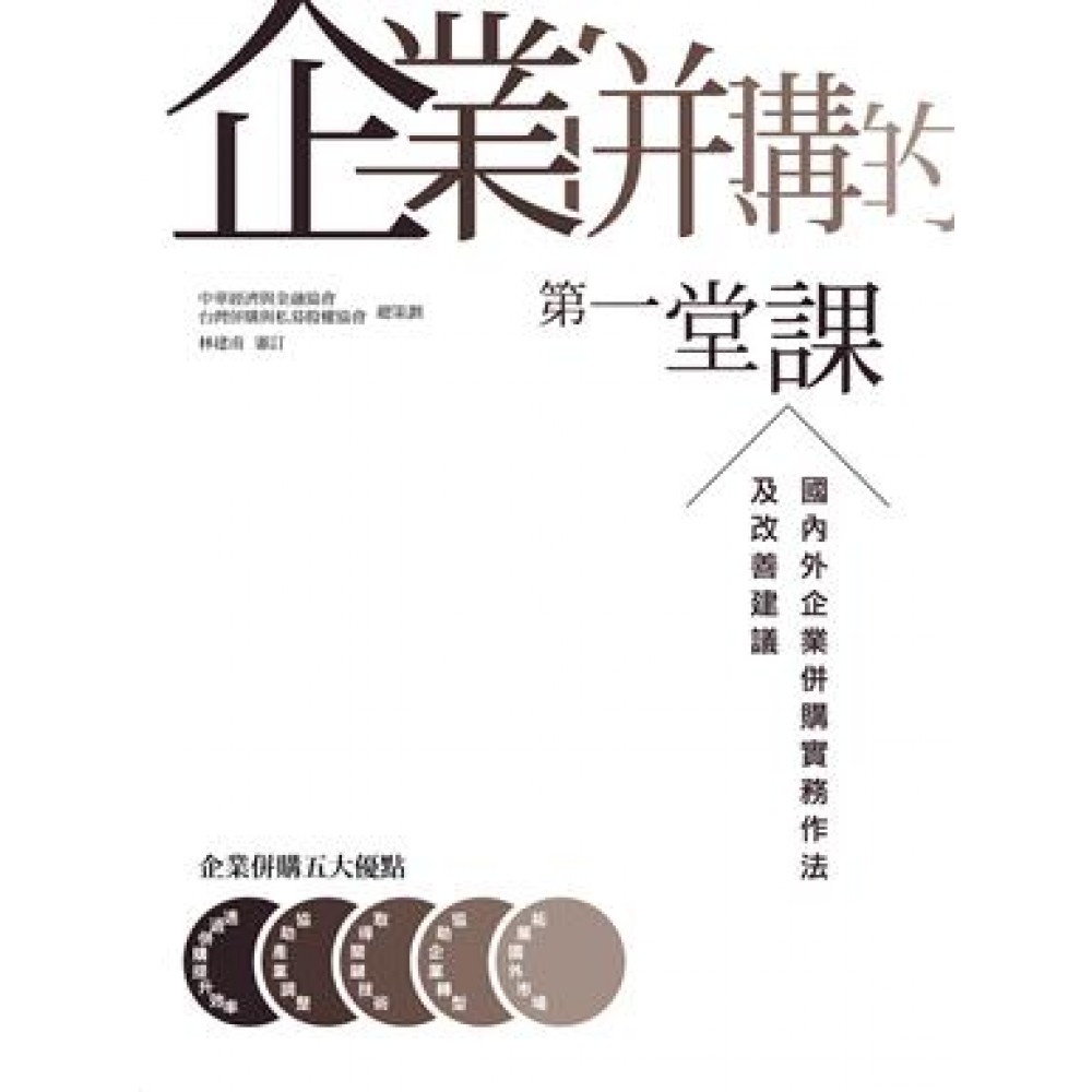 ,推薦序, 企業布局的有利工具──「併購」財團法人中華經濟研究院院長 吳中書 ,審訂序, 健全「併購」,台灣金融業才能打亞洲盃台灣經濟研究院院長 林建甫 第一章 企業併購的重要性與必要性 ,第一節, 企業併購的定義與意義 ,第二節, 企業併購的重要性 ,第三節, 企業併購的必要性 第二章 併購實務上常見的手段與策略 ,第一節, 實務上常見的手段與策略 ,第二節, 國內案例分析 ,第三節, 國外案例 ,第四節, 結論 第三章 企業併購實務爭議及法令探討 ,第一節, 主要國家企業併購法規簡介 ,第二節, 企業併購面臨的實務爭議 ,第三節, 國內企業併購法規之探究 第四章 健全我國併購市場遊戲規則的具體建議 ,第一節, 併購三大爭議問題解析 ,第二節, 建議 ,第三節, 結論 參考文獻