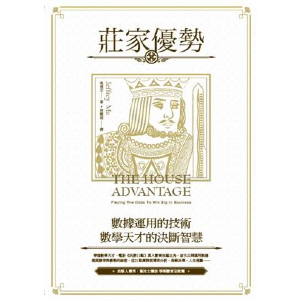 具說服力……任何覺得自己數學不好的人都能從中學會厲害的決策方法。 ──《出版人週刊》 生動的實例加上簡潔的分析,馬愷文說明了任何想在業界成功的人都不該害怕做出「具爭議」的決定。──《富比士雜誌》 馬愷文和他的朋友在拉斯維加斯神出鬼沒,以高超的數學法則算牌,賺進了大約600萬美元。他們把「21點莊家」打得落花流水,而且還把21點賭局變成一種高獲利的生意。馬愷文教我以獨特的方式審視金錢、生意,以及只有靠著探索那些灰色地帶和打破成規才能夠得到的成功。──班.梅立克,電影《決勝21點》原著作者 地球上沒人能寫出這樣的書。── 羅伯.奈爾(Rob Neyer),ESPN 自麻省理工學院畢業後,馬愷文成功成為跨領域的專家,包括21點玩家、選擇權交易商、網路創業家。他的經驗有助於解讀具爭議性的數字,使用客觀的分析,讓企業做出聰明決定。他的故事是有利的保證,讓各業的領導人相信《莊家優勢》這本書。── 比利.比恩,《魔球》真人實事改編主角、奧克蘭運動家球隊總經理 馬愷文寫了一本包著商業書外衣的哲學書……《莊家優勢》巧妙地混合了對人性的觀察、對數字的智慧、商業觀念及常識。──威廉.龐士東,《囚犯的兩難》 作者
