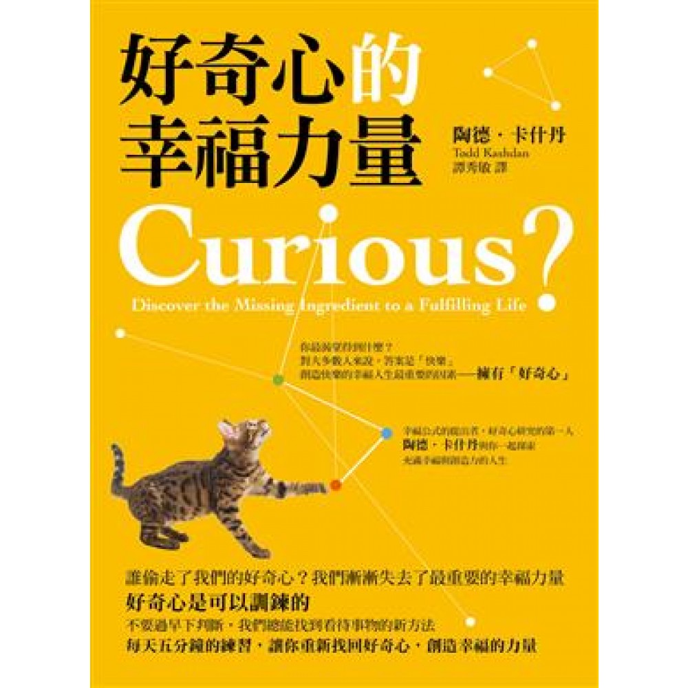 測測你的好奇心 (<好奇心和探索量表II>(Curiosity and Exploration Inventory II)) 引言 尋找幸福人生 第一章 為什麼人生不快樂 好奇心的基本法則/一種人生態度/誰偷走了孩子的好奇心/輕鬆適應改變的能力/好奇心:探索的動力 第二章 好奇心的作用 法官和牧羊犬/好奇心是成長的引擎/不確定因素讓快樂更持久/好奇心vs.確定性/好奇心的三大特徵/好奇心的五大好處 第三章 大腦渴望新鮮事物 負向思考:早期預警系統/負向偏誤與正向補償/遊戲:好奇心的副產品/三磅重 的好奇探索者/追尋獎賞vs.擁有獎賞/好奇心的兩種模式/記憶扮演的角色 第四章 好奇時刻 幸福人生由幸福時刻組成/日常的愉悅與平淡時刻/學會分配時間和精力/接受,然後改變你的人生派/誠實地給時間貼上標籤/日常生活中的五種時刻/轉換視角,激發興趣/鍛鍊好奇心的初級方法 第五章 創造持久的興趣與激情 充滿激情的追尋之旅/興趣和意義的交集/當意義點燃激情時/價值觀:意義的催化劑和嚮導/透過分享,加強興趣/工作:幹活? 職涯? 使命? /如何為工作注入更多意義/如何增強他人的興趣 第六章 人際關係的獎賞 兩位深陷愛河的未來科學家/透過人際關係拓展自我/為什麼人際關係如此重要/點燃激情,吸引他人/好奇心的非語言表達更有力/溝通技巧:平衡焦慮與興奮/持久親密關係的追尋/持久愛情的三大秘訣/強烈連結的干擾因素/為人際關係注入新奇感/將他人帶入你的婚姻中 第七章 好奇與焦慮的最佳組合 在回避與探索之間掙扎/好奇心:焦慮的一劑良藥/善用才能和焦慮/焦慮就像害怕犯錯/好奇心與社會角色和身分/當普通的焦慮感變成大問題時/適量的焦慮:略微緊張最好/最佳組合:高新奇性、高應對力、高興奮度/焦慮應對策略 第八章 好奇心的黑暗面 反常、令人生厭、造成損害/癡迷/社會資訊的尋求/不惜一切尋求刺激/怪異的性趣/變態的好奇心 尾聲:發現人生的意義和目標 不顧一切追尋意義/找尋方向/追尋人生目標/實現人生目標三途徑/向他人學習人生目標/當機會和挑戰出現時/積極主動探索新事物/一個刻意的、漸進的過程/充滿好奇的人生 附錄:練習和工具 誌謝