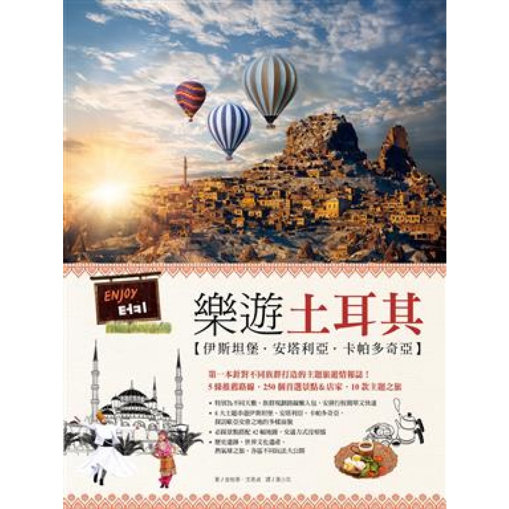 搭上繽紛熱氣球,俯視世界文化遺產與極美壯闊大地──土耳其! 穿越古今,走訪橫跨過去和現在的考古學遺跡, 一探連結歐洲和亞洲,融合東西方文化共存之地。 現在就從台灣直飛土耳其,來趟神祕又深度的探險! 第一本針對不同族群打造的主題旅遊情報誌! 5條推薦路線.250個首選景點&店家.10款主題之旅.獨特街頭小吃大公開! 本書特色 特色1:針對不同天數、族群規劃路線懶人包,人氣區域輕鬆串遊! 前往土耳其要怎麼玩?想仔細感受古老國度的迷人氛圍、和情人一同留下美好回憶,或是追尋世界文化遺址、宗教朝聖?在土耳其旅遊有多種不同的主題可以選擇,讓你在最短的時間內玩得盡興!本書特別規劃5款精華路線,結合許多一生必遊的重要景點來規劃,只要暢遊5大精華行程,就可充分感受土耳其的魅力! ★利用夜間巴士,超效率遊玩精華土耳其9天7夜 搭乘夜間巴士,同時解決交通與住宿問題,在睡夢中前往非去不可的伊斯坦堡、卡帕多奇亞、棉花堡、塞爾柱等精彩景點! ★和孩子一起旅行,在古老大地上追尋歷史遺跡 土耳其擁有許多遺址與度假景點,是歐洲和亞洲交會、基督教和伊斯蘭教相遇的國度,富有多元教育意義,最適合親子大手拉小手,同遊融合多樣文化之地! ★遊遍所有浪漫景點,情侶、新婚夫妻的土耳其蜜月之旅 利用夜晚在城市間移動,並活用卡帕多奇亞、安塔利亞、費提耶等行程,實現夢想中的羅曼蒂克背包旅行! 特色2:踏上歷史遺跡、世界文化遺產、熱氣球等主題之旅,遍賞文化奇景! 依主題提供可以新奇玩樂的旅遊情報,當地特色料理、街頭小吃、伊斯蘭教及基督教聖地、文化遺址等,豐富的類別讓你快速了解土耳其,找到最適合自己的旅遊方式和地區。 ★探訪世界文化遺產的富裕國度 處處是寶物的土耳其,列名世界文化遺產的就有10處,目前亦有許多文化遺產正在接受審核!充滿中世紀風味的番紅花城舊城區、被譽為「精靈煙囪」的格雷梅國家公園、特洛伊戰爭所在地、西臺帝國的早期首都哈圖沙遺址⋯⋯豐富的珍貴遺跡不容錯過! ★感受聖人情懷,基督教聖地巡禮 尋訪《聖經》裡出現的場景!諾亞方舟、堪稱「安那托利亞的耶路撒冷」的尚勒烏爾法、 「約翰啟示錄」的7座教堂⋯⋯懷想聖人傳教的堅忍,與將生死置之度外的廣大胸襟。 ★品嚐土耳其街頭特色小吃 在土耳其旅行的魅力之一,就是嚐遍街頭小吃!沙威瑪、芝麻餅、軟糖、帶有鹹味的優酪乳、滴漏咖啡、Efes啤酒⋯⋯大享融合中西飲食文化的美食饗宴! ★非買不可的獨特風情紀念品 抵擋惡魔與負能量的守護之眼的藍色惡魔眼、擁有獨特風味的土耳其茶及雙層子母壺、最具代表性的手工地毯⋯⋯一定要通通帶回家! 特色3:景點介紹搭配42幅地圖,暢遊土耳其8大地區╳250個景點! 最豐富詳細的景點介紹&Best Tour路線規劃,搭配分區地圖、交通方式、換匯方式,土耳其各區玩樂亮點一網打盡!此外,還有清真寺裡必須遵守的禮節、體驗博斯普魯斯海峽遊船等小提醒,讓你當個知識豐富且有禮的旅人! ★融合亞洲和歐洲、過去和現在的魅力之都──伊斯坦堡 遊歷當地歷史遺跡,走讀融合羅馬、拜占庭、鄂圖曼帝國的文化!伊斯坦堡舊城區聚集許多歷史遺跡、紀念建築,是歷史、文化、觀光的中心,在這瑰寶之地,有聖索菲亞博物館、蘇丹艾哈邁德廣場、藍色清真寺、君士坦丁方尖碑、埃及市場等經典景點,適合一一漫步品味! ★探訪文明的起源地&土耳其的觀光重鎮──安那托利亞中部 偏佈峽谷和山丘的高原地形,是土耳其佔地最廣的區域!在土耳其首都安卡拉走訪安那托利亞文明博物館、安卡拉城、奧古斯都羅馬神殿、羅馬浴場遺址,再前往超人氣的卡帕多奇亞,搭乘熱氣球升上天空,俯視壯觀的奇岩群與地下城市! ★滿佈世界文化遺產&美麗的度假中心──愛琴海 絕無僅有的奇特景觀!在像雪般的石灰層之地棉花堡,欣賞內含石灰的溫泉水流洩而下,創造出白色的城堡,是到土耳其不得錯過的熱門觀光區!前往古城貝加蒙&塞爾柱克,造訪衛城、紅色教堂、阿蒂蜜絲神殿、以弗所遺跡與聖母瑪利亞之家,親見古代奇景!