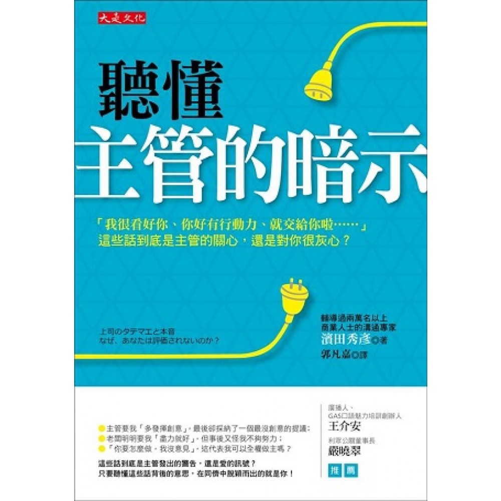 推薦序 聽懂主管的話,不如聽懂主管的心 廣播人、GAS口語魅力培訓創辦人/王介安 在我的著作《和任何主管都合得來》中,提到經過我們的調查研究知道,和主管溝通順暢,是工作中快樂指標的第一位。 我們如何站在主管立場思考,了解主管的內心世界呢?一旦你練好了這門功夫,你的快樂指數將越來越高。遺憾的是,許多上班族認為:「忠於自己才是快樂,何必用熱臉去貼別人的冷屁股?」然而,所有人際溝通個案都顯示,溝通是以「理解」為前提,並非以「自我」為前提。可能你會想,主管也應該「理解我」呀! 主管為什麼能在主管這個位子?多數是他們有戰功、經驗、能力、技術……等,因此他們大多不會不主觀。以我自己為例,在許多大型公司擔任經理人期間,由於壓力超大,很難客觀,常以自己的成功經驗法則來帶領團隊。對於那些能站在我立場思考的部屬,我對他們就會有比較高的好感度,因此當我成立「GAS口語魅力培訓」,便常勉勵學生多練習換位思考的能力。 主管有很多種,不同的個性展現不同的領導風格。在我們的研究中發現,表達方式太委婉曲折、太直接簡短、太冗長繁複,這三類主管(前輩)會讓人覺得難相處。因為他們常想到什麼就說什麼、沒有量化指標、指示不明確。我們必須從他們的個性、語氣,重新思考和他們之間的關係。 本書《聽懂主管的暗示》羅列許多主管話語的分析拆解,讓人看了不禁會心一笑。當你按圖索驥,很容易想像你的主管是怎樣的人?本書描述的這些主管,多半是比較在意內心感覺的,因此,如何拆解他的思考,成了重要功課;如何正中下懷回應,成了一門學問。 台灣的職場溝通情境,與日本的相關性很高,尤其本書作者濱田秀彥提到的情境十分寫實,真是箇中高手。不知道以下這些情境,你經歷過嗎? • 有些主管讃美你,其實是說你還有進步空間。 • 有些主管不喜歡把話說死,為的是不想承擔太大責任。 • 有些主管交代工作目標很模糊,是因為他也沒太多具體的想法。 • 有些主管喜歡說反話,你聽不懂是白目。 • 有些主管「建議」你可以這樣做,其實是「命令」你要這樣做。 • 有些主管喜歡在話語中酸你一下,如果你覺得他只是在開玩笑,那就完了! • 有些主管會表示「授權給你」,並不表示你可以全權做決定。 • 有些主管會說「我們開誠布公吧!」,不代表你可以什麼都說。 • 有些主管常問你「然後呢?」,是他想知道你做這件事的動機,而不是你接下來要做什麼事。 • 有些主管會直接嗆你,是想激你,並不是要你閉嘴,但你卻閉嘴不說了! 以上這些狀況,是不是心有戚戚焉?有沒有一點無奈?是否讓你感到困擾?如果是,這本《聽懂主管的暗示》一定要擺在辦公桌上,以便經常翻閱。希望你能更懂主管的心。 讓主管跟你說話,覺得好輕鬆 利眾公關董事長/嚴曉翠 職場類的書,目的都是希望讀者在工作上能夠趨吉避凶、無往不利、飛黃騰達。而影響你在職場升遷最重要的關鍵人物,當然就是主管,因此聽懂主管的話,特別是話中有話的真正意涵,自然是個重要的學習課題。 溝通是門有趣的藝術,日本人講話比台灣人更含蓄,因此聽懂主管話中的意思,顯然比起台灣的職場環境更不容易;相對的,也讓作者對這些主管常說的話中暗示,能整理得更完整。對於一般工作者而言,不管趨吉或避凶,這都是一本讓你在面對面對職場溝通時,非常受用的參考書。 不過,我們不可能時時猜想主管的某句話是什麼意思;或者一直回頭去翻找本書提到主管這麼說的時候,是要告訴我什麼。因此,從根本面,有邏輯的分析主管的溝通模式,以及想想為什麼主管不能對你直接說出真正想說的話,也許是讀完本書後的另一個進階思考。 根據我多年觀察,主管不對部屬說真心話,有以下幾種可能:第一,因為你是新人,所以主管還在拿捏對你講話的輕重度。因此你應該多多觀察主管跟其他資深同事的互動及溝通語言,才能做出比較好的判斷,以及盡快融入環境的準備。 第二,因為你有玻璃心,但工作能力還可以,或是對主管來說還算有價值,所以他不敢用太直接的方式跟你溝通。如果是這種情況,建議你應該盡速修正自己的心態與形象,因為沒有老闆會把重要任務或領導職位,交給一個有玻璃心的人。 第三,因為你容易爆衝,但你仍有工作價值,目前主管也還不想跟你決裂,所以對你講話就像對客戶一樣客氣。如果主管以前不是這樣跟你說話,現在卻對你越來越客氣;而你又曾經跟他是親密的工作夥伴,那麼請調整一下你的脾氣,不要再用「有話直說」這種藉口,因為這會成為壓垮你們彼此關係的最後一根稻草。 第四,因為主管已經放棄你了,為了以後還要碰面,不想弄壞關係,所以當然說話就不直接了,因為他已經沒有什麼真心話要對你說了。 看完這本書,似乎會讓工作者覺得當部屬很累,要花那麼多心思去猜主管究竟在說什麼、想什麼。但本書真正的涵意其實是,做主管更累,為了要跟你溝通卻不能直接說,得花那麼多心思去包裝自己的話。 所以,如果你想在職場追求卓越,建議好好研究如何讓主管、甚至是所有共事的人,都覺得跟你說話時可以很輕鬆,如此一來,你才能成為全面成功的人。 前言 想出人頭地,你得聽出主管的意思 當主管說:「我對你有很高的期待喔!」我相信很多人都會為此感到困惑,不知道該如何正確解讀這句話。主管這樣說,到底是在鼓勵我,還是在對我施加壓力呢