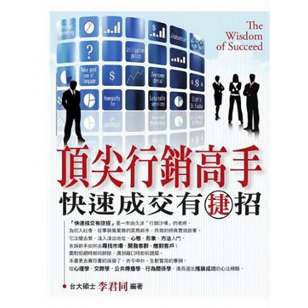本書特色 行銷高手‧頂尖8大心法 1.◎永續服務:口碑勝過千言萬語。 2.◎屈尊降貴:毛遂自薦容易湊效。 3.◎略施小惠:有錢可使懶鬼推磨。 4.◎順勢而為:草船借箭藉勢東風。 5.◎善用語言:花花大轎人人都愛坐。 6.◎戰勝拒絕:嫌貨往往才是買貨人。 7.◎活用策略:攻心為上,快刀斬亂麻。 8.◎網路行銷:善用現代科技網路電話。