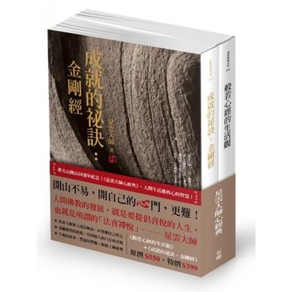 佛光山開山50週年紀念 開山不易,開自己的心門,更難! 《星雲大師心經典》 人間生活最核心的智慧! 「人間佛教的發展,就是要提倡喜悅的人生,也就是所謂的『法喜禪悅』」。——星雲大師 ◎星雲大師深入淺出解說,直指佛法最核心 ◎遠離痛苦的根源,得到恆久的自在和喜悅 ◎生動的故事、豐富的譬喻,輕鬆了解經典 《成就的祕訣:金剛經》 沒有不能跨越的困難,成就的祕訣很簡單:有佛法,一切就有辦法! 王品集團董事長戴勝益、美學大師蔣勳、知名媒體人陳文茜女士推薦! ★王品集團董事長戴勝益閱讀《成就的祕訣:金剛經》後,不禁讚歎:「如何發揮個人、組織,甚至企業盈沛的能量,以星雲大師大作中的箴言去實踐,不僅開啟了眾生智慧,更領悟了世間極致的哲理與祕訣。」 ★不論是個人的處世哲學,組織、企業永續經營的法門,讓星雲大師帶領你開展生命的無限潛能,悟得、過得、證得「無所住的自在人生」,一起在人間大成就。 《般若心經的生活觀》 打開心門,轉變人生,從《心經》開始! 「我不想講深奧的妙理,我只想傳達般若如何運用在我們的生活之間。」──星雲大師 ★星雲大師開宗明義闡述,這本《般若心經的生活觀》就是為了讓每個人重新認識自己,強調每個人的心念! ★唯有透過自我修行我們最珍貴的「心」,發揮心的力量於無限大,才能成就最本然、最美好的生命!