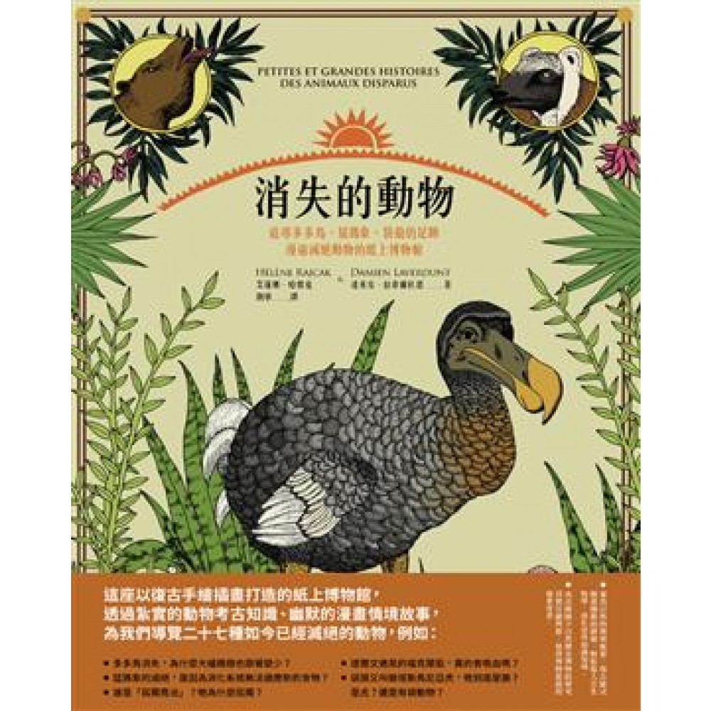 前言 穿越時空,追尋消失的足跡 人類在踏上月球之前,早已充分發掘了自己的星球。從大洲到大洲,從海洋到海洋,從島嶼到島嶼,我們不斷從大自然中發現過往的生命留下的圖像與痕跡:骨骼、羽毛、草木,以及各種化石。 關於這個主題,我們可以查詢考證各種標本、插圖、證據。法國國家自然歷史博物館長期透過各種展覽介紹最原始的植物、未曾描繪過的原始動物,然而,試圖呈現不久之前才消失的動物—牠們的骨骼、皮膚、留在化石上的痕跡或影像—這項工作非常艱難。 科學的歷史不啻是一條漫長的路。那就像在未知的海洋上冒險、進入神祕的森林裡探索、在遺世獨立的世界中旅行。每一次遇見新的生命、看見鮮艷的色彩、嗅聞醉人的芬芳、發現奇特的形體,隨之而來的都是對自然的驚歎……多少世紀以來,人們總是帶著無比的熱情對新發現的領土或物種進行分配,占為私有。 如今,大自然變得寂靜多了。馬達加斯加的古原狐猴已完全滅絕,從此以後,這種大型狐猴只出現在與牠們有關的故事或傳說當中。同樣滅絕的還有多多鳥、馬達加斯加侏儒河馬、恐鳥、哈斯特巨鷹,以及其他光是名字就足以令人感到驚奇的生物。 很少有文獻勇於指出因人類過失而消失的物種,並且透過文字讓牠們重現。當然,人類不是導致牠們消失的唯一原因;來自環境的壓力(無論史前或現在),讓原本即因氣候和地理環境變化造成的危急情況持續惡化。狩獵、人口數量驟增、森林退化、全球工業化⋯⋯等,也都是加速動植物物種不斷減少的因素。 列出消失的動物,並且讓人們記住牠們,就是這本精美書籍最重要的目的。書中的每一頁,都將帶你進行一趟穿越時空的旅行。 法國國家自然歷史博物館 西西莉・科林(Cécile Colin)、呂克・維孚(Luc Vives) (本書科學顧問)