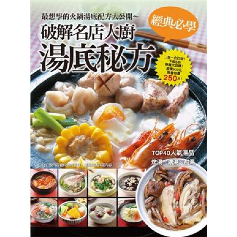 此生必學湯底配方大收錄 經典基礎高湯 美味的高湯,是廚房的秘密法寶,尤其是濃縮食材精華的高湯,無論是煮湯、炒菜、煮麵粥,馬上變身頂級美味。 排隊火鍋湯底 天冷就想要來一鍋,在家吃更是幸福,本單元除了要教大家最熱門的火鍋湯頭外,還有暴紅的養生鍋物與簡單的速成火鍋,讓你輕鬆煮、免排隊、想吃什麼就吃什麼! 家常美味湯品 家常湯品怎麼煮最好喝?清湯、濃湯、羹湯…三餐、宴客、團圓不可少的美味湯品配方,各種大廚偷吃步,這裡通通報你知! 香濃麵粥湯底 湯麵、粥品一直是台灣人最愛吃的主食之一,尤其是鮮美的湯頭,看似平凡,卻總是令人欲罷不能、再三回味。本單元要教大家如何煮出香濃味醇的高湯,無論搭配麵、米粉、冬粉或粥,通通超級贊! 一次學會250碗最好喝的湯 TOP40人氣湯品 本單元為你精選出最受台灣家庭歡迎的40碗人氣湯品,無論是清湯、羹湯、燉湯、濃湯還是甜湯,簡單易學易做,自己動手做一點都不麻煩,只要搞懂小撇步,想喝餐廳級好湯不用出門排隊喔! 經典肉類湯品 家常肉類煮湯,是台灣家庭最常見的湯品之一,不論雞肉、排骨、牛、羊肉,都有些經典的湯品令人垂涎!本單元要告訴大家,肉湯花點時間熬固然美味,但只要善用烹飪工具如用電鍋,有些肉類料理只要簡單加點配料,滋味口感就很豐富,而且簡單易學、更快速。 元氣海鮮湯品 想要煮出香嫩Q彈又多汁的海鮮湯,其實沒有特別技巧,只要食材夠新鮮,簡單調個味,就很美味!本單元要告訴你,如何搭配其它豐富的配料、調味料,讓口感升級、滋味滿分。 香甜蔬菜湯品 蔬菜除了炒、涼拌外,還能怎麼吃最香甜?不妨試試用四季蔬菜做湯品,簡單又方便,還能輕鬆把蔬菜的養分、香甜滋味通通吃下去,本單元要告訴你,使用多樣蔬果就能輕鬆煮出好喝美味又健康的蔬菜湯。 養生藥膳燉湯 藥膳滋補養生,簡單方便;將簡易藥膳和天然食材一起燉煮成養生湯品,只要懂得配料和去腥的技巧,藥膳湯品也可以很美味,本單元精選30多種屬性溫和的養生湯品,適合全家人一起享用。 香醇西式濃湯 濃郁香醇的西式濃湯,將食材精華都融入美味湯頭裡,喝一口仿佛喝到了所有山珍海味的甘甜美好,如果你也喜歡這種也可當輕食正餐享用的濃醇滋味,那就更不能錯過本單元的大廚祕訣。 幸福美味甜湯 甜湯,是一年四季都少不了的美味,不論冰的、熱的都各有其獨特風味,尤其吃完豐盛的料理後,來碗甜滋滋的甜湯,那才真的算是滿足!如果你也喜歡這種甜蜜的好滋味,翻開本單元你一定會覺得更幸福! 本書特色 此生必學湯底配方大收錄 天想煮一鍋好喝的湯,卻不知如何下手嗎?其實,只要掌握簡單配方用法與一點點小祕訣,任何食材都可變身好喝湯品。本書要告訴大家餐廳大廚珍藏的好喝湯頭祕訣,與暴紅排隊的火鍋湯底獨門配方,以及各類湯品的正確熬湯偷吃步,讓你清楚了解美味技巧關鍵,輕輕鬆鬆就可以變化出令味蕾驚豔的極致湯品。 一次學會250碗最好喝的湯 想要煮一鍋美味十足、香氣四溢的好喝湯品,其實並沒有想像中的困難,只要懂得食材搭配的技巧,輕輕鬆鬆就能變化出美味的好湯,就算只是利用冰箱隨手取得的簡單食材,也能端出餐廳級的絕妙好湯。本書特別規劃了「TOP40人氣湯品」、「經典肉類湯品」、「元氣海鮮湯品」、「香甜蔬菜湯品」、「養生藥膳燉湯」、「香醇西式濃湯」、「幸福美味甜湯」七個單元,要把大廚珍藏超好喝的煮湯偷吃步通通報你知!