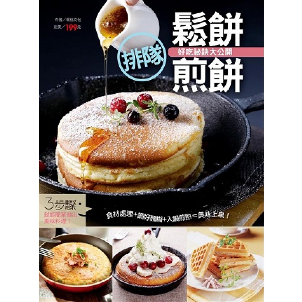 [流行鬆餅] 美式鬆餅、日式基礎鬆餅、比利時鬆餅、格子鬆餅、蜂蜜鬆餅… [鹹味煎餅] 韓式海鮮煎餅、什錦蔬菜煎餅、月亮蝦餅、金錢蝦餅、大阪燒、培根馬鈴薯煎餅、白醬蘑菇煎餅、法式蝦卵煎餅、夏威夷海鮮煎餅、泰式酸辣魚丁煎餅、豆漿玉米肉鬆煎餅、義式烤椒煎餅、素火腿時蔬捲餅、山藥煎餅、蔬果煎餅… [甜味煎餅] 三色地瓜煎餅、橙汁法式煎餅、咖啡煎餅、南瓜奶油煎餅、麻花生薄撐… 重點訴求 好吃的鬆餅、煎餅令人垂涎三尺,有名的店家總得大排長龍,費用也不便宜。其實鬆餅與煎餅一點也不難,麵糊配方的比例正確,加入各式美味的配料,利用平底鍋,就能輕鬆完成。 只要3個步驟輕鬆上桌。 步驟一.處理食材—粉類過篩、蔬果洗淨切適當大小、肉類海鮮先汆燙或炒香。 步驟二.調好麵糊—攪拌均勻,視稠度調整比例,再過篩靜置。 步驟三.入鍋煎熟—各種類鬆餅、煎餅的煎法技巧大公開。 這次我們將經典與人氣的鬆餅煎餅配方收錄之外,還有利用巧思變化配料的創意口味也一併收錄!