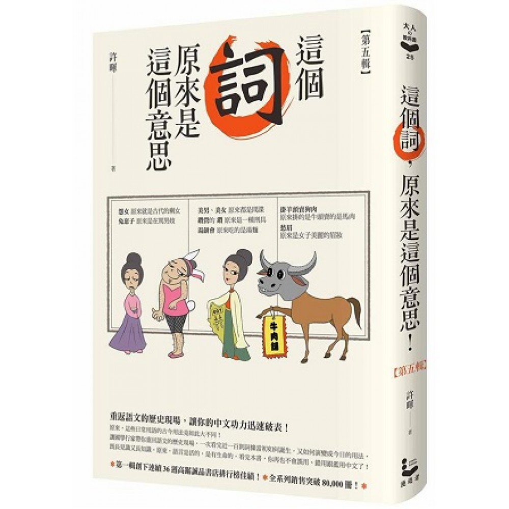 ●《這個詞,原來是這個意思》第一輯,2011年創下連續36週高踞誠品書店排行榜佳績! ●《這個詞,原來是這個意思》第一、二、三、四輯,總銷售 80,000冊,掀起兩岸中文國學書熱潮。 什麼,我們每天都在用的這些詞,原來是這個意思! 「夥伴」為什麼會用來指同伴 唐朝的兵制,府兵的最小單位為「火」,之所以稱為「火」,是因為這十人同灶共火而食。「火伴」的稱謂即由此而來,最早乃是一個軍事術語,後來為了區別於專指火焰之「火」,於是就添加了一個人字旁,寫成「夥伴」,詞義也從同灶共火而食的士兵擴展成了同伴之意。 「兔兒」原來是用來指娼妓 為什麼古人把妓女和兔子聯繫起來呢?原來,這與古代中國對兔子習性的錯誤認識有關。古人以為,傳說雌兔舔舐雄兔的毫毛,望著月亮就可以受孕,然後從口中生出幼兔。從此之後,這一荒誕不經的傳說竟然就成了定論。甚至博學如蘇東坡,也認為「野人或言兔無雄者,望月而孕」,於是兔子就被比附為婦女的「不夫而妊」。 「怨女」原來就是古代的「剩女」 「怨女」不能解釋為心懷怨恨的女子,「怨」其實是「蘊」的假借字。「內無怨女,外無曠夫」的意思就是:宮內沒有蓄積多餘的青年女子,宮外也就不會有空無家室的青年男子。「怨女」就是指蓄積的女子,不正是今日「剩女」一詞很生動的寫照嗎? 「喬裝」原來是踩高蹺的表演 「喬」的本義是人登上高樓,順理成章地引申為高的意思。由於人登高的舉動跟踩高蹺的動作極為相似,因此又順理成章地把踩高蹺的人稱作「喬人」。表演踩高蹺時,踩高蹺的人還要妝扮成各種角色,而且多以漁翁、媒婆、傻公子、小二哥、道姑、和尚等下九流人物為主,扮相滑稽,逗觀眾歡心,正是因為喬人表演的踩高蹺之戲,「喬」才由此引申出假裝、改扮的意思 讓國學行家帶你重回語文的歷史現場, 一次看完近兩百則詞條當初如何誕生,又如何演變成今日的用法, 既長見識又長知識。 原來,語言是活的,是有生命的, 看完本書,你再也不會誤用、錯用跟濫用中文了! 不說不知道,說出來嚇你一大跳! 以下這些詞,你知道它們的由來與用法的演變嗎? 「燈紅酒綠」的酒真的是綠色的 「湯餅會」原來吃的是湯麵 「掛羊頭賣狗肉」原來掛的是牛頭賣的是馬肉 「美男」、「美女」原來都是間諜 「鑽營」的「鑽」原來是一種刑具 「打耳光」原來是模擬割耳朵的戰爭行為 「雞姦」原來跟雞毫無關係 「抱背」原來是暗指男同性戀 「兔崽子」原來是在罵男妓 「蕭郎」為什麼是指情郎 「隱疾」到底是指什麼疾病 「祕辛」到底是形容什麼樣的祕密 還有更多更多……