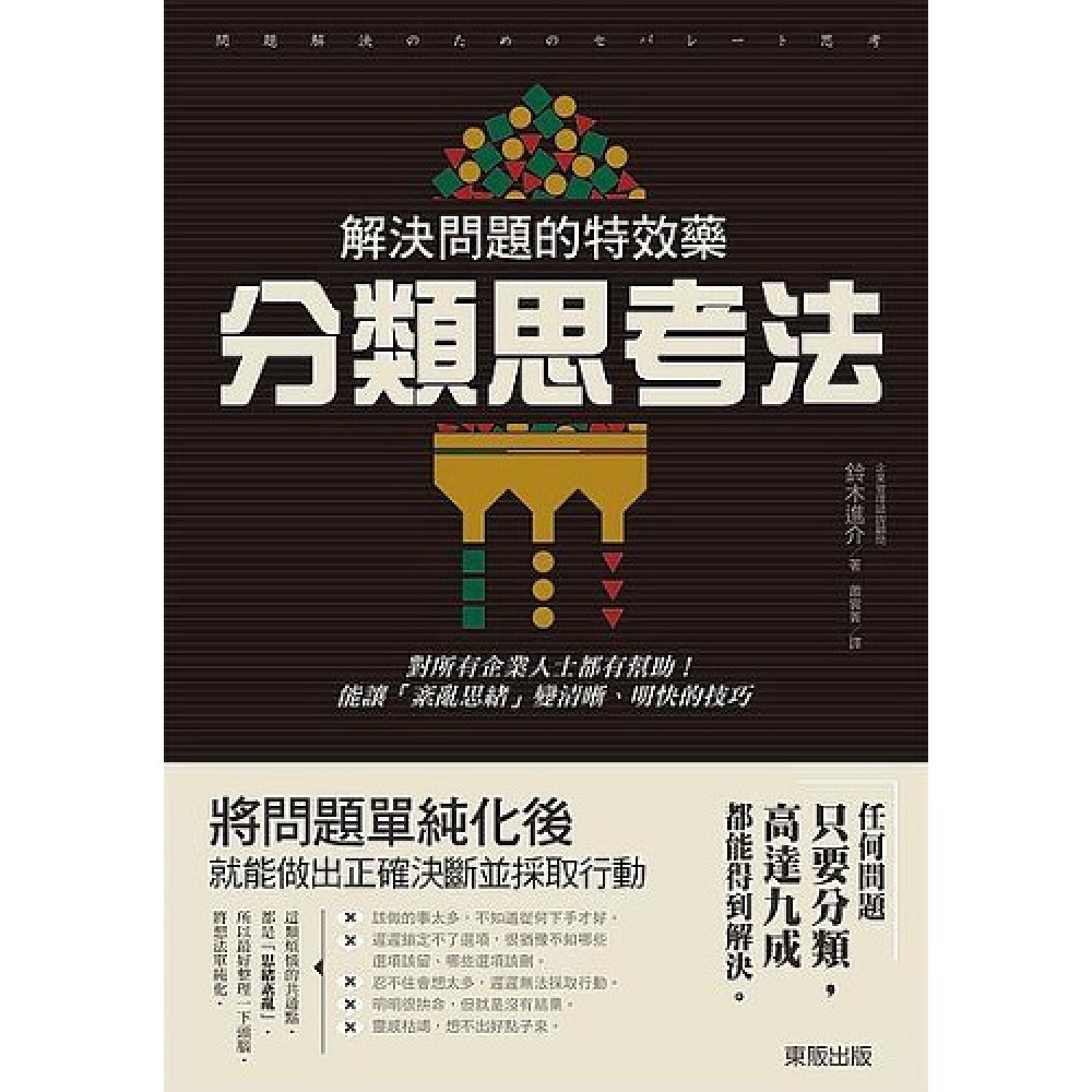 鈴木進介 企業管理諮詢顧問,Compas股份有限公司董事長,近年更以「思考整理家」身分致力於演講活動與人才教育等工作。25歲創業時,因為是從「沒經歷」、「沒資金」、「沒人脈」、「沒技術」的四重困境白手起家,整整度過3年多收入不穩定的挫折生活,後來發現「只要整理思考,有9成問題都能得到解決」,從此對思考的整理術茅塞頓開,之後花超過10年的時間獨自研究,進而整理出一套體系。這種能簡單解開困難問題的「分類思考法」,廣泛受到自由工作者、新興企業、股票上市上櫃公司等企業青睞,提供超過100家公司諮詢服務,一年更舉辦超過100天的研修活動,累計參加「分類思考法」的講習會人次超過1萬人。不只在協助經營者做出正確決斷與養成新世代管理階層上得到絕大支持,也經常上電台、電視演出,甚至致力於作家活動,不斷擴大活動領域範圍。著有《思考更要斷捨離:1分鐘丟掉紛亂思緒,贏回犀利頭腦》(究竟出版)等書。 作者官網 www.suzukishinsuke.com 作者電子雜誌 www.suzukishinsuke.com/contents/