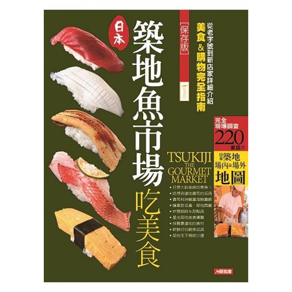 【特 集】奢華煮魚店 好想大啖美味的煮魚 【場內市場】品嚐魚市場的道地精華 市場美食完全攻略 〔壽司〕〔魚‧海鮮〕〔麵〕〔蓋飯〕〔西餐〕〔咖啡〕 築地才買得到的精品 場內市場完全購物指南 〔食品〕〔廚具〕〔魚市商品〕 【插圖專欄】接下來才是重頭戲!夜晚の築地導覽 〔場內市場篇〕〔場外市場篇〕 【場外市場】名店‧實力店盡在五條路上及大樓裡 場外市場美食完全導覽 〔門跡通〕〔西通〕〔中通〕〔東通〕〔公園通〕〔共榮會大樓〕 【番 外 篇】值得推薦的咖啡‧甜點 魚市場不止賣新鮮魚貨 場外市場購物完全導覽 〔新鮮魚蝦〕〔鮪魚〕〔鮭魚‧魚卵〕〔海產加工品‧魚干〕 〔泡菜‧熟食〕〔肉品‧蛋〕〔蔬菜〕〔珍味‧其他〕〔廚具‧餐具〕 【特 集】來築地採買春季食材及用品!築地春季購物導覽 【特 集】尋找自己的那一味 築地玉子燒10選 築地才買得到的名品 超推!築地伴手禮 築地魚市場!店舖記載一覽表