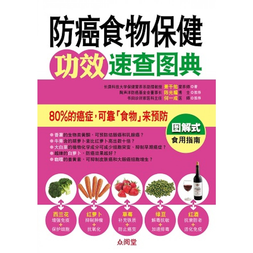 作者自序 饮食,是防癌的基础 萧千佑营养师 导读 本书使用说明 Part 1防癌抗癌饮食关键 癌症是怎么产生的? 癌症是吃出来的? 易得癌的生活习惯有哪些? 怎么吃可以有效防癌? Part 2 防癌必吃20种明星蔬菜 山药 健体防病的药食 ●山药炖排骨汤●日式山药三吃 ●山药豆腐冻●养生山药锅 番薯 防肠癌的必备良药 ●番薯酥饼●养生番薯冻 ●番薯芥菜鸡汤●番薯粉蒸肉 白萝卜 杀菌防病白人参 ●白萝卜炖鸡腿●红烧羊肉萝卜 ●凉拌红白绿●虾皮炒萝卜丝 红萝卜 抗氧护眼人气王 ●香芹拌萝卜●胡萝卜炒素肉 ●五彩烘蛋●南洋胡萝卜蔬菜汤 牛蒡 排毒素的根茎蔬菜 ●和风牛蒡炖肉●牛蒡炖鸡 ●芝麻香炸牛蒡●五行蔬菜防癌汤 绿、白花椰菜 抑制致癌物活性 ●酥炸咖哩花椰菜●韩式花椰泡菜 ●缤纷花椰色拉●焗烤双色花椰 大白菜 高C火锅良伴 ●凉拌白菜心●胶原白玉汤 ●开阳白菜●金黄奶焗白菜 菠菜 补血护眼有一套 ●香拌蒜味菠菜●菠菜炒猪肝 ●菠菜起司烤蛋●奶油菠菜浓汤 高丽菜 固胃保骨好蔬菜 ●焗烤五彩锦囊●罗宋蔬菜汤 ●高丽菜营养蛋饼●台式高丽泡菜 芥菜 抗癌冬季蔬菜 ●金丝烩芥菜心●芥菜炖鸡汤 ●蟹肉扒芥菜●木须炒芥菜 菇蕈类 提高T细胞活力 ●奶油烤金针菇●杏鲍菇炒彩椒 ●咸酥炸香菇●百菇蒸饭 芽菜类防止细胞突变 ●银芽烧豆腐●银芽香炒腐皮 ●辣拌黄豆芽●客家炒粄条 芦笋 抑制发炎的春蔬 ●芦笋鲑鱼卷●酱烧芦笋 ●芦笋炒虾仁●芦笋综合果汁 西红柿 乳癌患者救星 ●西红柿起司蛋饼●西红柿炒豆包 ●义式西红柿牛肉饭●家常西红柿炒蛋 苦瓜 清热解暑抗癌瓜 ●咸蛋炒苦瓜●梅渍苦瓜 ●苦瓜排骨汤●苦瓜镶肉 南瓜 消化系统的卫士 ●枸杞炖金瓜●优格拌金瓜 ●南瓜综合海鲜汤●南瓜鸡蛋布丁 茄子 防胃癌的紫精灵 ●凉拌蒸茄子●鱼香茄子 ●塔香炒茄子●味噌煮茄子 洋葱 强韧血管家常食材 ●香烤洋葱肉串●香拌洋葱鲔鱼 ●日式洋葱拌面●洋葱香炒牛柳 大蒜 动脉硬化的克星 ●家常糖蒜●蒜苗炒花枝 ●蒜子烧黄鱼●蒜泥蒸虾 姜 活血止吐辛香料 ●家常三杯鸡●老姜麻油鸡 ●姜汁拌菠菜●姜奶布丁 Part 3防癌抗癌必吃的10种超级水果 草莓 美白淡斑幸福果 ●酸甜苺果冻●草莓冰沙 ●草莓果酱●草莓酒 橘子 维持肠道清洁 ●法式橘香可丽饼●橘子果酱 ●陈皮牛肉●桔利鲷鱼片 苹果 排除体内毒素 ●苹果野菇烧鸡肉●苹果蔬菜糙米卷 ●苹果银耳瘦肉汤●苹果鲔鱼色拉 蓝莓 护眼明眸抗氧化 ●蓝莓奶酪●蓝莓果酱 ●香酥蓝莓派●蓝莓马芬蛋糕 木瓜 防止致癌物质癌变 ●木瓜牛奶●青木瓜排骨汤 ●凉拌青木瓜丝●百香果木瓜 奇异果 舒缓情绪好帮手 ●鲜果优格●奇异果香鸡柳 ●奇异果虾仁盅●奇异果香蕉汁 哈密瓜 强化巨噬细胞 ●哈密瓜红萝卜汁●蜜瓜椰汁西米露 ●哈密瓜果冻●义式哈密瓜卷火腿 柠檬 高C抗氧清香果 ●柠檬烤秋刀鱼●金桔柠檬汁 ●泰式柠檬鱼●柠檬爱玉冰 葡萄 抑制异常细胞形成 ●红烧葡萄鸡●紫晶葡萄汁 ●葡萄干桂圆甜饭●凤芹葡萄汁 无花果 帮助延缓肿瘤发展 ●无花果山药煲鸡汤●红酒无花果酱 ●无花果炖排骨●无花果红茶 Part 4 防癌抗癌必吃的10种五谷杂粮 杏仁 养生润肤宫廷秘方 ●杏仁核桃露●杏仁酥片 ●宫廷杏仁茶●杏仁炸鸡肉丸 燕麦 增强肠道免疫 ●红豆燕麦粥●什锦海鲜燕麦粥 ●燕麦瘦肉粥●燕麦牛奶布丁 薏仁 祛除水肿的美颜药 ●猪肚四神汤●薏仁绿豆糙米粥 ●薏仁冬瓜蛤蛎汤●冰糖薏仁浆 糙米 捍卫肠道健康 ●原味糙米浆●田园蔬菜糙米饭 ●糙米参鸡汤●味噌鲑鱼烤饭团 黄豆 预防乳癌发生 ●黄豆炖排骨汤●自制原味豆浆 ●佃煮黄豆海带●黄豆炖蹄膀 绿豆 消暑排毒绿精灵 ●绿豆茯苓鸡汤●绿豆粉皮拌黄瓜 ●绿豆椰汁西米露●绿豆莲藕露 黑豆 补肾黑发的长生豆 ●蜂蜜黑豆●黑豆奶冻 ●黑豆鲑鱼汤●黑豆核桃酱 芡实 健脾止泻的养生药材 ●薏仁芡实冬瓜汤●芡实山药瘦肉粥 ●芡实糯米鸡●当归芡实羊肉汤 小米 防止细胞变异 ●小米云耳煲肉粥●小米山药甜饼 ●黑糖蜜小米粥●小米酒酿煮蛋 荞麦 防致癌物累积体内 ●日式荞麦凉面●原味荞麦饼 ●荞麦糖球●荞麦海鲜咖哩炒饭 Part 5防癌抗癌必吃的12种优质食物 海菜类 提高身体防御力 ●干贝海带炊饭●高钙海菜饼 小麦草 平衡人体酸碱值 ●小麦草果冻●柠檬小麦草汁 啤酒酵母 修复肠胃机能 ●啤酒酵母黄金炸鸡●啤酒酵母蔬菜手卷 绿茶 流行感冒的克星 ●碧螺春茶叶蛋●泡沫梅纤绿茶 橄榄油 护心保胃好帮手 ●义式生牛肉●香蒜橄榄油意大利面 麻油 润肠通便长寿油 ●麻油枸杞虾●麻油红凤菜 乳酸菌制品 保肠健胃清道夫 ●自制无糖优格●桑椹酸奶 蜂蜜 伤口修复魔法师 ●蜂蜜芦荟石莲露●蜂蜜枸杞菊花冻 红酒 补血强心佳酿 ●红酒炖洋梨●红酒渍洋葱 味噌 抗癌养生调味品 ●味噌海带芽汤●味噌炒牡蛎 咖哩 抗发炎的辛香料 ●咖哩鲜虾●鲈鱼绿咖哩 黄耆 益脾胃的养生药材 ●黄耆枸杞养生茶●黄耆党参炖鸡汤