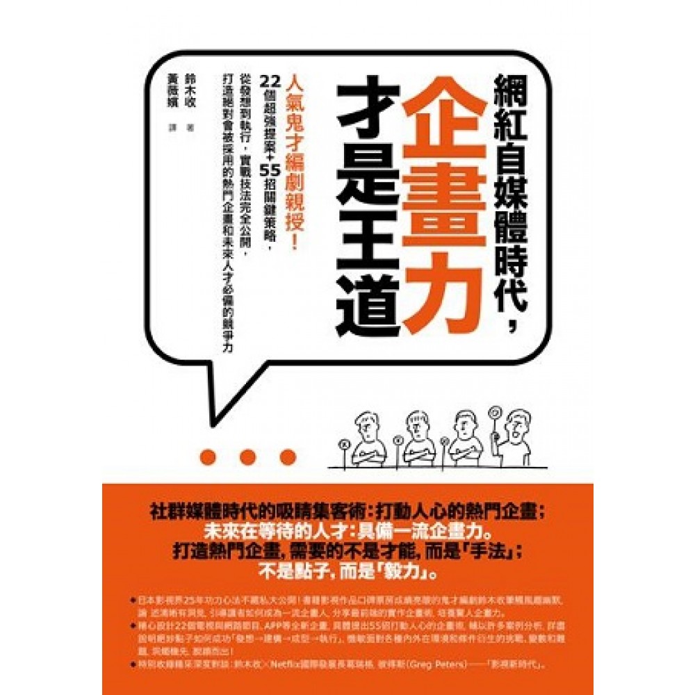 社群媒體時代的吸睛集客術:打動人心的熱門企畫; 未來在等待的人才:具備一流企畫力。 打造熱門企畫,需要的不是才能,而是「手法」; 不是點子,而是「毅力」。 耗費無數時間心力,還是不得要領,想不出好企畫? 催生人氣企畫又需要什麼樣的思考與行動? 人氣鬼才編劇親授!「一定會被採用的企畫」祕訣! 囊括所有意想不到的實用技法與具體心得,各行各業都適用! ◆投身日本影視界25年功力心法不藏私大公開!書籍影視作品口碑票房成績亮眼的鬼才編劇鈴木收筆觸風趣幽默,論述清晰有洞見,引導讀者如何成為一流企畫人,分享最前端的實作企畫術,培養驚人企畫力。 ◆作者精心構思設計22個電視與網路節目、APP等全新企畫,並具體提出55招打動人心的「企畫術」,輔以許多案例分析,詳盡說明絕妙點子如何成功「發想→建構→成型→執行」,以機敏靈巧地面對因應各種內外在環境和條件衍生的挑戰、變數和難題,洞燭機先,脫穎而出! ◆特別收錄精采深度訪談:鈴木收╳Netflix國際發展長暨日本Netflix董事長兼社長葛瑞格.彼得斯(Greg Peters)──「後電視新時代的觀眾,追求什麼樣的影音內容?」。 「我在這本書裡介紹自己構思的電視與網路節目、APP等全新企畫,並提出『企畫術』,也就是我構思的過程,同時回顧我過去參與製作的電視節目、電影、書籍等,藉由這種方式公開企畫的思考過程和創作方式。我認為書裡說明的企畫思考方式及精神論,不僅對於電視圈,或許也能夠成為多數人在工作上、思考上的靈感來源。」──本書作者 鈴木收 社群媒體時代,各行各業都需要有能力提出新點子的人才。打造人氣企畫需要什麼樣的思考與行動呢? 鬼才編劇鈴木收投身日本影視界25年,創作的書籍影視作品口碑票房成績亮眼,特將他打造無數熱門企畫的功力心法不藏私大公開,筆觸風趣幽默,論述清晰有洞見,引導讀者如何成為一流企畫人,分享最前端的實作企畫術,培養驚人企畫力。 他精心設計22個電視與網路節目、APP等全新企畫,具體提出55招打動人心的企畫術,輔以許多案例分析,詳盡說明絕妙點子如何成功「發想→建構→成型→執行」,機敏面對各種內外在環境和條件衍生的挑戰、變數和難題,洞燭機先,脫穎而出! 書末特別收錄精采深度對談:鈴木收╳Netflix國際發展長葛瑞格.彼得斯(Greg Peters)──「影視新時代」。 鈴木收親授!「一定會被採用的企畫」技法,各行各業都適用的10大規則: 1.引起別人對自己好奇,正是「企畫」的第一步 2.從生活中找尋小故事 3.收集未知的資訊 4.自己是否熱情投入? 5.每天看一部電影 6.找到沒人注意到的「潮流」 7.引人關注的重點有複數個 8.贊同者最好有兩成 9.懂得裝傻的人才能打破常識 10.只要換個瓶子,隨處可見的東西就能重生 鈴木收的企畫經: 暴露缺點反而增加說服力/找出企畫亮點也是企畫力/只要換個瓶子,隨處可見的東西就能重生/事先做好「保險」的重要/引起別人對自己好奇,正是「企畫」的第一步/「限制」是琢磨企畫時的必備要素/用講究的福神漬搭配咖哩飯/贈品也需要「企畫力」/缺乏真實性,就不會有人感興趣/人人都對「與自己有關」的事物有興趣/懂得利用期待的企畫才有力量/「共鳴」要謹慎使用/利用「遠」X「近」製造新鮮感/非同業的一番話,正是抓住「即時」的意外機會/取名的原則是「負面X正面」/找到讓人想要取暱稱的名稱/聽從別人的喜好選片/最重要的資訊來源是「人」/觀眾也能參與其中,同享喜怒哀樂/太客氣只會讓企畫顯得不上不下/「惹人煩」好過「沒印象」/排除「預定和諧理論」/人的弱點正是集客魅力之所在/最後皆大歡喜是企畫的關鍵/人「嫉妒的瞬間」很有意思/提供兩種觀看方式,接受的觀眾群更廣/相信數據資料不會顯示的潛力/重點在於能否當個傻瓜/被嫌棄的企畫才是好企畫/企畫要加入跳脫企畫的要素/對企畫人來說,最重要的是「毅力」/背後有強烈情感的企畫充滿力量/想像自己遊走在道德邊緣,突破極限/在企畫中植入自我風格 亞馬遜讀者好評 ◆米山智裕@Share讀書:學會如何讓你的種子(點子)綻放(實踐)! 有些人是「右撇子」,有些人是「左撇子」。有人叫你想些有趣的企畫時,你有何反應?想不出「右撇子」與「左撇子」能夠做些什麼的人,建議看看這本書。本書作者曾經推出許多以電視節目為主的熱門企畫,他大膽公開自己現階段想到的22個新企畫,加上構思過程與精神理論,集結成這本人人皆可實踐、培養出「驚人企畫力」的作品。一邊閱讀這22個企畫一邊想想自己會怎麼做,自然而然能夠鍛鍊你的企畫力。 ◆Amazon顧客:了解鈴木收先生的發想力有多厲害的一本書 書中毫不保留地公開自己的電視劇、綜藝節目、APP等各式企畫及重點。書裡的企畫皆非常有趣,很希望有機會見到它們具體實現。但這本書不只是有趣,也遵循各種引人入勝的方法,因應時代潮流。讀完之後可實際感受到受人歡迎的作品的確有其原因。其他還有人氣節目的幕後製作祕辛等,令人忍不住想一口氣讀完。 ◆unicorn:具體說明企畫的意圖 利用具體的新企畫,仔細交待一個綜藝節目等企畫案的背景與策略。時代背景、觀眾期望、身為企畫人的堅持等想法誕生的過程都是靈感的來源。重要的是如何具體成形,這就是點子王與專業人士之間的差別。 ◆HIDE:以讀物而言很有趣 可啟發靈感的一本書。書中的企畫術是以電