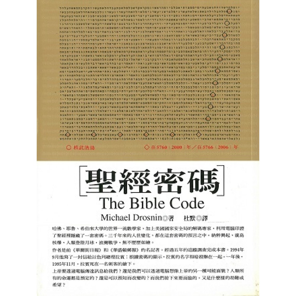 三千年前成書的基督教聖經,原來隱藏了一套預示人間一切事的密碼。 如今,由於電腦運算的輔助,一位以色列數學家破解了這套密碼。他在一份國際科學期刊所提出的報告,受到包括哈佛,耶魯等全世界著名數學家的肯定。 本書作者是《華爾街日報》和《華盛頓郵報》的記者。他以記者的立埸,對這項科學發現展開調選,並完成這本有關此事的第一份完整報導。 迄今.還沒有人知道,聖經密碼是否精確地預示了未來的歷史。但所有專家都承認,密碼確實存在,而且可能預示了一埸真實的「末日」,一場核武世界大戰。 上帝要透過電腦傳達訊息給我們,還是我們可以透過電腦想像上帝的另一種可能面貌足人類所有的命運都是預定的,還是可以預如而改變的,而我們接下來要面臨的,又是什麼樣的劫難或希望。