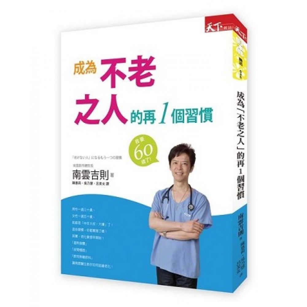 在本書中,南雲醫生公開長期持續下去就可以不老的七十七種實踐項目。從日常生活中的小細節開始,教你如何讓自己養成良好的習慣,以保有年輕又健康的身體。其中的內容包羅萬象,從身體外觀的毛髮、每人不同體型的體態、保養肌膚以防皺紋、令人困擾的體味與口臭、如廁時便秘的困擾、品質良好的睡眠、營養的飲食方式、清爽俐落的體態姿勢養成、保有良好的的體力與免疫力……等。 本書分為十一個章。 依序為: 關於「禿頭、白髮—頭髮的煩惱」/關於「體型」/關於「肌膚」/ 關於「味道」/關於「水和便秘」/關於「睡眠」/ 關於「飲食」/關於「姿勢、裝扮」/關於「體力、免疫力」/ 關於「抗衰老」/關於不老之人的「導師」。 其中,每個章裡又細分幾項小節,為讀者們做主題明確的解說。 每小節的篇幅不過數頁,不僅適合忙碌的讀者閱讀,也可以藉此為自己一項一項累積生活中的小習慣,讓自己維持青春與活力。 本書重點 避免被貼上難以除去的「老化」標籤 只要瞭解原因,改變習慣,你也能常保年輕。 人生有幾個階段。從嬰兒到幼兒,從幼兒到小孩,再從小孩到青春期,然後長大成大人。老人的「陰影」在不知不覺中會潛藏到每個人身上,但當自己驚覺時,其實在很早以前自己早就被貼上「老人」的標籤了。站在醫學的角度來說,「老人」的年齡標準,男性是三十歲,女性是五十歲。只要能知道老化的原因,要解決問題就會很簡單。 本書內容每篇讀來輕鬆明瞭,在南雲醫生以醫學的角度清楚分析之後,更讓人可以放心試著實踐每項簡單且不難的良好習慣。 還在擔心自己為何老得很快嗎?閱讀本書,就可以清楚知道答案何在。