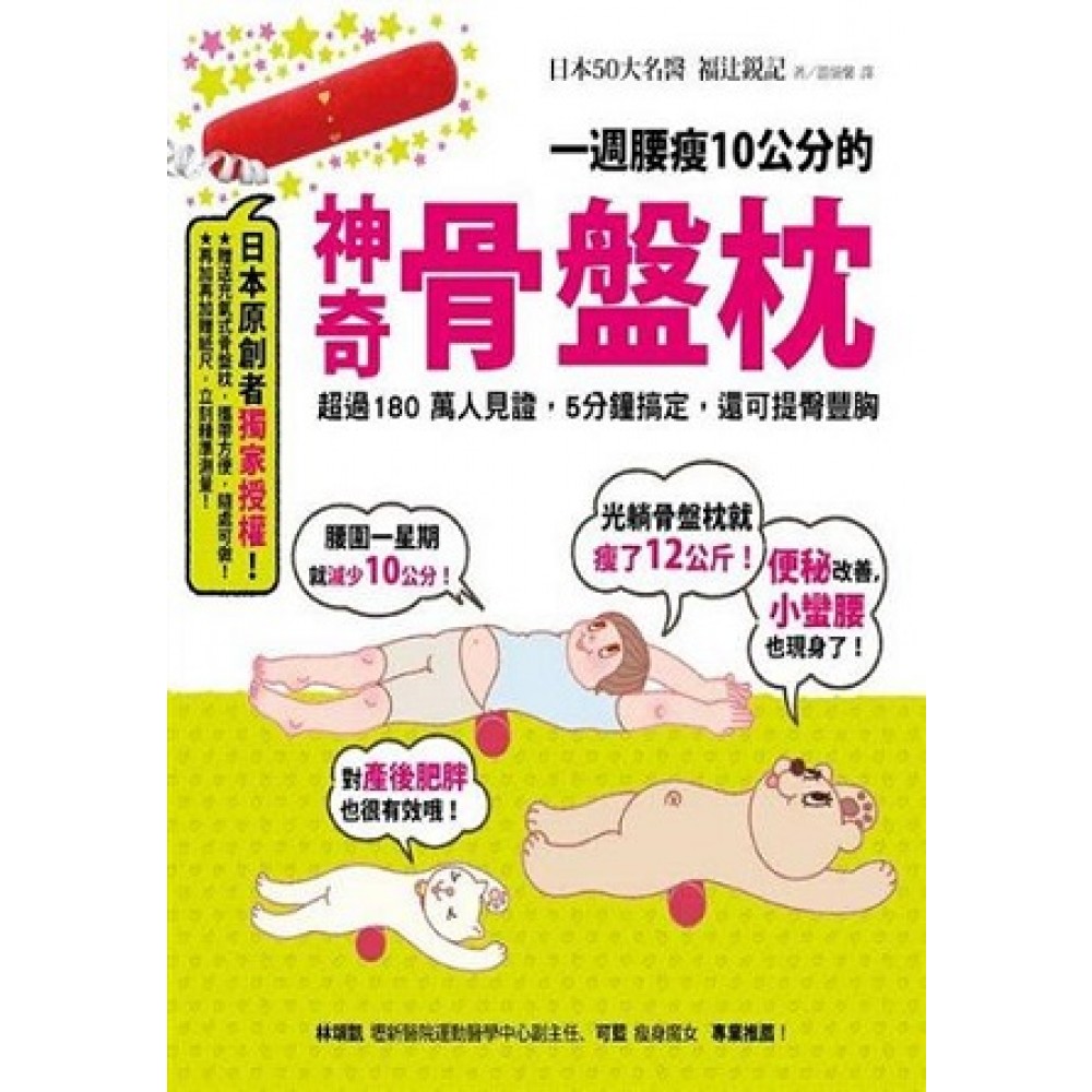 推薦序1 矯正歪斜,自然擺脫疼痛與肥胖! 我的工作是幫助病人擺脫慢性疼痛,一直希望能發展出簡單的伸展運動,幫助大家擺脫打針、吃藥的夢魘。據統計,受疼痛所苦的病患中,有66.5%真正病因是長期姿勢不良造成,尤其許多人使用電腦時姿勢不正確或時間過長,讓慢性疼痛患者有年輕化的趨勢。其實只要適度的舒展,維持正確的姿勢,不必吃藥、無需花錢,就能見效。 這本書的作者醫師,在累積上萬名病患的診治經驗中,研發出骨盤枕治療方式,其中多年深受腰痛之苦的病患,竟然在試用一兩次過後就有起色,這正是透過骨盤枕矯正歪斜、舒展肌肉所獲得的效果。 除了慢性疼痛問題,過胖也是現代人健康的隱憂。我們院內體重管理中心開辦瘦腰競賽活動以來,每年都吸引許多民眾參加,也都有參賽者交出漂亮的成績單。但我有時會發現一些老面孔,也就是去年或前年參加、甚至得過獎的參賽者,怎麼今年又來了?原來許多人因生活忙碌,往往不容易維持運動習慣,也就不斷地在減肥與復胖中掙扎,紛紛希望能有更「輕鬆」的減肥方法。 而本書介紹的骨盤枕瘦身法,是由第一代「平躺減肥法」而來,只要以正確的姿勢躺在骨盤枕上,就能矯正骨盤歪斜、改善內臟功能,自然可以瘦得輕鬆、瘦得漂亮! 這本書所附贈的神奇骨盤枕,確實是很不錯的保健用品,簡單卻實用,不管是針對塑身或身體慢性疾病與痠痛問題,都具有保健的效果! 壢新醫院運動醫學中心副主任 林頌凱醫師 推薦序2 謝謝骨盤枕讓我骨盤正!!!! 骨盆歪斜一直都是影響我身材的最大問題,骨盆一歪,身上就很容易長出贅肉,尤其是腰後方的那塊腰內肉。我因為工作的關係,長時間穿高跟鞋錄影,髖骨旁邊總是會隱隱作痛,特別是右邊髖骨,有時候蹲下來站起來還會聽到「喀啦喀啦」的聲音,但是一忙下來,根本挪不出時間去找整脊老師,任憑腰痠背痛影響著我走路,導致我右邊髖骨的肉越長越厚,才讓我警覺到應該正視這個問題。 骨盆歪斜不僅會讓身材變形,還會有婦女病及各種痠痛症狀產生,O型腿、胸部下垂、腹部游泳圈、鬆垮臀等等都會找上門,直到我遇到了神奇的骨盤枕。 骨盤枕瘦身法是一種不用花錢就能瘦的減肥法,在日本很風行。聽說很神奇,竟然躺著就能瘦。起先,我只是單純的試試看,看看能不能好睡一點,沒有抱太大期望,沒想到,隔天早上我醒來,格外的舒服,睡覺也特別好睡,讓我驚訝不已,決定認真的來躺個十天,並且記錄下來。 晚上睡覺前,先量了我的腰圍、臀圍、下腹圍,並每天記錄下來。生活作息並沒有特別的改變,只是在睡前先做一次骨盤枕的基礎瘦身操,每天就一次5分鐘,做完之後再做瑜伽。 神奇的事情發生第在十天的早上! 第十天的實際測量結果,首先是腰圍瘦了1.3公分,臀圍瘦了2公分,小腹瘦了3.2公分!是的!3.2公分!短短的十天,就這麼有效果,讓我非常驚訝,不僅是對這數字感到驚訝,而是我的睡眠品質也好多了,走路時會疼痛的右邊髖骨也因為骨盆的位置正確了,而感到舒服,謝謝骨盤枕讓我骨盤正! 10天尺寸變化 腰圍68.6cm→67.3cm -1.3 cm 臀圍95.2→92.7cm -2.5 cm 小腹87.2cm→84cm -3.2 cm