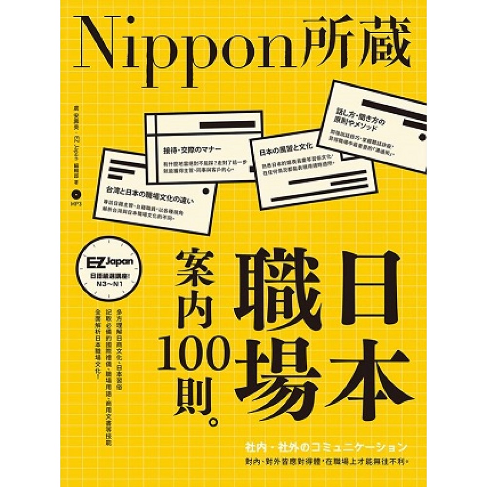 《Nippon所藏日語嚴選講座》全面解析日本職場文化! 多方理解日商文化、日本習俗; 記取必備的國際禮儀、職場用語、商用文書等技能, 成為進入日商的最佳助力! 日本職場必備的生存法則! 「探討比較台日職場文化」「說話技巧×聽話訣竅」 「社內社外應對技巧」「日本習俗文化」「交際禮節方式」 ★兼具知識與實務的日本職場案內100則★ 「Nippon所藏」系列介紹: 專為中高級(N3~N1)日語學習者打造,EZJapan第一本日語嚴選講座。 閱讀日本,或語言,或文化,或古典,或時尚。 用一雙眼,追逐日本的瞬息萬變;領略日本的傳承與創新;探索日本的100種美。 「Nippon所藏」為你獻上日本的薈萃珍藏。 本書特色 特色一 觀察×透視──日本職場文化 日商最注重什麼?想進入日商必須具備哪些基本技能與態度?只有日文能力還不夠? 專題特輯單元特別專訪日籍主管、台籍職員,以不同角度解析日本職場文化的特別之處。除了能順利踏出前進日商的第一步,還可以先了解在日商必須注意的「眉角」,讓你不輕易踩到職場地雷! 在日本文化中「上が決めたことだから、下が従う」(上司決定,部下遵從)是很理所當然的。但在台灣如果上司用「頭ごなし」(不容分說)的態度命令下屬,常常會令下屬反彈, 甚至心懷「為什麼要聽你的」的負面情緒。在面臨重大決定時,下屬對上司的決策若有不認同的地方,最好是事前表達並協調溝通看看。 特色二 入門篇──學習基本禮儀與談話應對技巧 「被道謝時該說……?」:「どういたしまして」(不客氣)什麼情況都能使用? 「日本的謙遜文化」:「まだまだです」(還有不足之處)是假客氣,適當的謙遜能和日本人培養好交情? 「儀態、打扮決定態度」:不僅內在要顧,外在也會影響他人對於自己任職公司的評價。 「不可不知──職場菠菜學」:「報」(報告)、「連」(聯絡)、「相」(討論),一項都不能少! → 不是很清楚卻擅自判斷就進行工作,經常會造成失誤與糾紛。為了避免這點,請大家勤加「報告」「聯絡」與「討論」,不可因為「感覺對方很忙」或是「不過就是個小問題」等理由就省略。 「隨聲附和是美德」:但語調一出錯,小心惹人不快? 「日本人不說『不』」:「すみません、ちょっと……」(不好意思……有點……),什麼!這是在拒絕嗎? → 最具代表性的例子,就是在拒絕邀約的情況。日本人會委婉地用「不好意 思……有點……」來表現。聽到這種不明確的回答,可能會讓對方感到非常焦慮。不過這種表現是基於日本禮貌文化的背景而生,日本人認為「直接拒絕是很失禮的」隱藏著考慮到對方的感受的意思。 特色三 實戰篇──「人際關係×業務交涉×接待事宜」 「交換名片流程」:拿到名片不可馬上收起?連擺在桌上都有既定順序? 「電話對應技巧」:統整對內、對外的電話慣用語列表,接打電話不慌張! 「e-mail書寫訣竅」:讓自己的e-mail不會成為同事、客戶眼中的垃圾信! 「口譯必備常識」:隨時隨地熟悉產業中的常用詞彙,以備不時之需。 「座位安排學問大」:在接待室、會議室、餐廳、交通工具中,依身分位階的不同就座? → 在日本,帶位這件事在腦海裡經常有「上座」「下座」的概念。即使在用餐的場所,日本人也會遵循這個基本認知來引導對方。而不光是用餐或會議時,轎車內的座位順序也是有學問的喔! 特色四 精進篇──熟悉日式習慣文化,增進交際手腕! 「吃一頓商業飯局」:該選什麼樣的餐廳?席間該注意什麼?每一環節都馬虎不得! 「下班後的酒聚」:拉近與上司、前輩的距離,增進與同事間情感的好機會! 「再見了,同事!」:同事要離職時,送什麼禮物才不會NG? 「重要送禮時期」:夏季的中元與冬季的年末和新年,是送禮給關照自己的人,表示感謝之意的好時機。 「有些數字用不得」:不只是「4」,連「9」這個數字也會在喜慶中避免使用! → 「4」除了能唸做「よん」或「よ」,還有「し」的讀音。「し」和「死」的讀音相同,所以被視為不吉利的數字。「9」可讀做「きゅう」或「く」。因為「く」和「苦」的讀音相同,當然也不被用於婚禮等慶祝的場合中。 「台式料理日譯大彙整」:向日籍客戶、同事介紹台灣料理的實用手札。 → 鹹蛋苦瓜──塩漬け卵とゴーヤーの炒め物もの → 鴛鴦火鍋──おしどりなべ → 大腸包小腸──もち米の腸詰めとソーセージの台湾式ホットドッグ ……想進入日商就必須注意的細節,通通都在這! 《日本職場案內100則》陪你深入理解日本職場的理念與規則,往日商職員之夢更進一步!