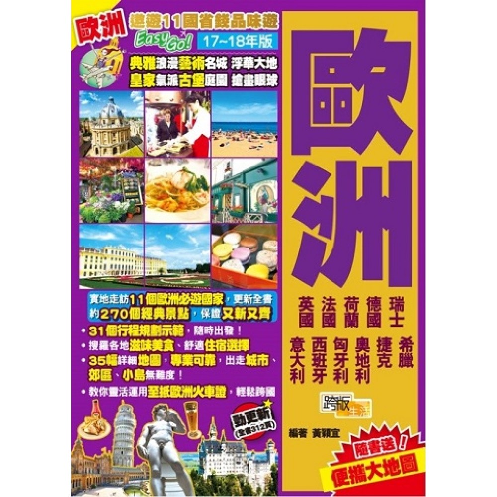17-18年新版新增了西方文明搖籃「希臘」的首都雅典及兩個愛琴海小島的人氣景點,包括連雅典人都愛逛的中央市集和普拉卡區、米克諾斯島最熱鬧的天堂沙灘、可欣賞到聖托里尼島最美日落的碉堡等,另外還更新了全書11個歐洲國家內容,資料更update更齊全,讓你的歐洲之旅更豐富精彩! 歐洲是不少人心目中的旅遊夢想國度,本書教你以省錢又不失品味的方式,遊遍歐洲11個國家,包括法國、英國、荷蘭、德國、意大利、瑞士、西班牙、匈牙利、奧地利、捷克及希臘,是遊歐洲必備的入門指南! 除了羅列約270個歐遊熱門景點,本書還詳細介紹各國交通資訊,教你聰明地購買及使用各國火車證及優惠車票,配以專業繪製的35幅景點地圖,盡情享受風光如畫的各地名勝。 想規劃一個豐富多元的多國行程,不必頭痛,本書示範了超過31個行程規劃,包括單國或是多國行程,亦有不同主題的行程,例如適合畢業旅行、情人、一家大小的都有,買了機票已可以隨時出發!作者還分享了40個歐遊不可不知的出發前後事項,讓你玩得更放心。
