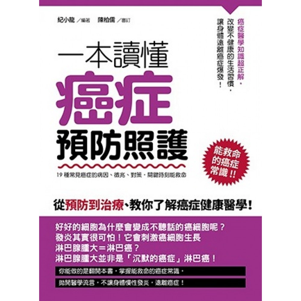 第一章:揭秘癌症 第二章:胃癌,華人的第一大癌 胃癌的常識1:不疼不難受,不代表沒事 胃癌的常識2:萎縮性胃炎,癌變的前奏 胃癌的常識3:消化不良、胃穿孔,和癌症沒有關係 胃癌的常識4:辣不致癌,醃漬食物容易致癌 胃癌的常識5:切掉胃,切不掉罹患胃癌的風險 第三章:肺癌,吸菸者的夢魘 肺癌的常識1:所有成年人的肺都是黑的 肺癌的常識2:吸菸致癌的途徑 肺癌的常識3:咳嗽、肺部陰影,兩個重要的早期信號 肺癌的常識4:定期照電腦斷層(CT),幫你防肺癌 第四章:肝癌,和肝炎密切相關 肝癌的常識1:肝炎可以變肝癌 肝癌的常識2:減肥藥殺死肝細胞 肝癌的常識3:大約 10%的肝硬化發展成癌 肝癌的常識4:沒人能治好肝硬化 肝癌的常識5:定期照超音波,幫你防肝癌 第五章:大腸癌,每五分鐘殺死一個人 大腸癌的常識1:瘜肉,大腸中的危險分子 大腸癌的常識2:便秘、腹瀉、放臭屁,都和瘜肉有關係 大腸癌的常識3:極易被誤認成痔瘡 大腸癌的常識4:和瘜肉有關,和年齡無關 大腸癌的常識5:只有腸道鏡檢能確定 第六章:胰臟癌,癌症之王胰臟癌,癌症之王 胰臟癌的常識1:致死率 100% 胰臟癌的常識2:胖傢伙,跑不掉 胰臟癌的常識3:慢性胰臟炎,需懂忌口 胰臟癌的常識4:深藏不露,暗中殺人 第七章:腎臟癌,擅長偽裝的惡魔 腎臟癌的常識1:注意不斷增強的腰部脹痛 腎臟癌的常識2:常偽裝成腎囊腫 腎臟癌的常識3:定期超音波,早發現、早處理 腎臟癌的常識4:腎臟癌需要切除嗎?切除多少? 腎臟癌的常識5:吃再多動物的腎,也防不了腎臟癌 第八章:膀胱癌,發病率最高的泌尿系統癌症 膀胱癌的常識1:憋尿憋不出膀胱癌 膀胱癌的常識2:尿頻、尿血、排尿困難,可能是癌變訊號 膀胱癌的常識3:尿液檢查、超音波可確認 膀胱癌的常識4:化工工人要當心 膀胱癌的常識5:好治療,易復發 第九章:前列腺癌,老年男性的剋星 前列腺癌的常識1:相對善良 前列腺癌的常識2:排尿困難要當心 前列腺癌的常識3:需要穿刺來確診 前列腺癌的常識4:90%的患者都能痊癒 前列腺癌的常識5:最喜歡向脊椎擴散 第十章:食道癌,一口一口吃出來食道癌,一口一口吃出來 食道癌的常識1:舌尖上的致癌美食 食道癌的常識2:吃過燙的食物、狼吞虎嚥,易導致食道癌 食道癌的常識3:蹲著吃飯,吃下癌症隱患 食道癌的常識4:吞饅頭團可以檢查食道 食道癌的常識5:確診要靠食道內視鏡 第十一章:鼻咽癌,一半患者在中國 鼻咽癌的常識1:聽力下降要當心 鼻咽癌的常識2:EB病毒,致癌的罪魁禍首 鼻咽癌的常識3:用鼻咽鏡檢、核磁共振發現蛛絲馬跡 鼻咽癌的常識4:放射療法,最常用的治療手段 第十二章:淋巴瘤,免疫系統的惡魔 淋巴瘤的常識1:淋巴結腫大未必是淋巴瘤 淋巴瘤的常識2:極易被誤診 淋巴瘤的常識3:只要長瘤,即為惡性 淋巴瘤的常識4:晚期無法醫治 第十三章:甲狀腺癌,情緒波動的惡果 甲狀腺癌的常識1:情緒波動大的人要當心 甲狀腺癌的常識2:5%的甲狀腺結節是癌 甲狀腺癌的常識3:手術切除是最常見治療方法 第十四章:黑色素瘤,「痣」者千慮 黑色素瘤的常識1:不聽話的黑色素細胞是元兇 黑色素瘤的常識2:哪個部位受刺激多,哪個部位的痣易惡變 黑色素瘤的常識3:當心有毛、易脫皮的痣 黑色素瘤的常識4:先出手,解決危險部位的痣 第十五章:乳腺癌,女性第一殺手 乳腺癌的常識1:胸大胸小都會得 乳腺癌的常識2:纖維增多,癌變前兆 乳腺癌的常識3:預防有手法,照著日曆,摸著查 乳腺癌的常識4:防癌,心情愉快很重要 第十六章:子宮頸癌,紅顏殺手 子宮頸癌的常識1:HPV病毒是罪魁禍首 子宮頸癌的常識2:糜爛不是癌 子宮頸癌的常識3:性生活出血要當心 宮頸癌的常識4:保持衛生,有效預防 子宮頸癌的常識5:晚期難以治癒 第十七章:卵巢癌,無聲殺手卵巢癌,無聲殺手 卵巢癌的常識1:發瘋的卵巢細胞是元兇 卵巢癌的常識2:看不見,摸不著,感覺不到 卵巢癌的常識3:沒人知道它如何發生 卵巢癌的常識4:任何女性,任何年齡,都可能得到 卵巢癌的常識5:定期做超音波,唯一的預防手段 第十八章:骨癌,兒童生命的狙擊手 骨癌的常識1:最容易盯上青少年 骨癌的常識2:在孩子身上,發展極快 骨癌的常識3:用 X光檢查,不如用電腦斷層查 骨癌的常識4:成年人要當心軟骨肉瘤 骨癌的常識5:截斷肢體,截不斷癌的發展 第十九章:腦瘤,最具迷惑性的兒童殺手 腦瘤的常識1:種類繁多,原因不明 腦瘤的常識2:頭痛、嘔吐、視力變差,都可能是它的信號 腦瘤的常識3:手術風險極大 第二十章:白血病,吞噬兒童的生命 白血病的常識1:白血球變成癌細胞 白血病的常識2:最常見的症狀是發燒 白血病的常識3:症狀複雜,極易誤診 白血病的常識4:甲醛、染髮劑、手機輻射,都不是致病真凶 白血病的常識5:種類繁多,並非每種都能治 第二十一章:時效防癌 時效防癌的常識1:要防癌,就要做有針對性的體檢 時效防癌的常識2:因人治癌,因癌治癌 時效防癌的常識3:治療癌症,要有打持久戰的意志 時效防癌的常識4:不存在「只要吃就一定不會罹癌」的食物