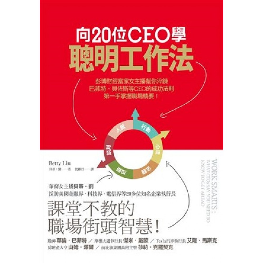 世上最聰明、最值得敬重的財經節目主播之一,在這本好書中,分享關於企業領導學的珍貴洞見——怎麼做會成功,應該避開哪些事。條理清晰的文筆,擲地有聲,卻又謙虛自牧,這本絕佳的指南是所有尋找新事業、想要東山再起或延續過去成就的人必讀書籍。 ——穆罕默德‧伊爾艾朗(Mohamed El-Erian)|太平洋資產管理公司執行長、美國總統全球發展委員會主席 為了所有在工作生涯中需要百尺竿頭,更進一步的人,貝蒂寫了一本充滿力量與洞見的書。書中蘊含當頭棒喝、直言不諱的啟示與有趣的個人故事,如果你想要成功,《向20位CEO學聰明工作法》是必讀的好書。 ——蘇西‧威爾許(Suzy Welch)|《10.10.10-改變你生命的決策工具》作者、《哈佛商業評論》前總編輯 貝蒂以《向20位CEO學聰明工作法》再度成功出擊,她從採訪世界各地執行長與政府官員的經歷中,萃取出動人的故事。若任何專業人士想要重整自己的工作與生活,邁向成功,《向20位CEO學聰明工作法》將提供珍貴無比的助力。傑出的新聞記者生涯帶給她豐富的「領導學體悟」,《向20位CEO學聰明工作法》提供豐富的資訊,相當激勵人心。貝蒂,謝謝你再度為我們帶來卓越的學習體驗。 ——迪克森‧道爾(Dixon Doll)|DCM風險投資公司共同創辦人、美國國家風險創投協會前主席、直播電視集團董事會成員 從容自在的對談永遠是奇蹟,尤其對談的雙方是電視主持人與來賓。但每次和貝蒂對談,都非常愉快自在,毫不費力,生動有趣,因為她本身就是一個令人愉快、好相處又有趣的人。 ——莫特‧祖克曼(Mort Zuckerman)|波士頓房地產公司董事長、《紐約日報》與《美國新聞與世界報導》出版商 貝蒂擁有傑出的能力,擅長引導位居高層的商業人士說出重要資訊。在這本最棒的新書中,她運用這些技巧,讓許多執行長與成功的專業人士闡述自己如何晉升上位——不只是分享他們做對了哪些事,還有他們做錯了哪些事。正當按照層級升遷的制度漸趨式微,上班族必須做好自己的終身生涯規畫之際,《向20位CEO學聰明工作法》是一本珍貴無比的指南——而且讀起來興趣盎然。 ——丹‧羅斯(Dan Roth)|LinkedIn資深編輯