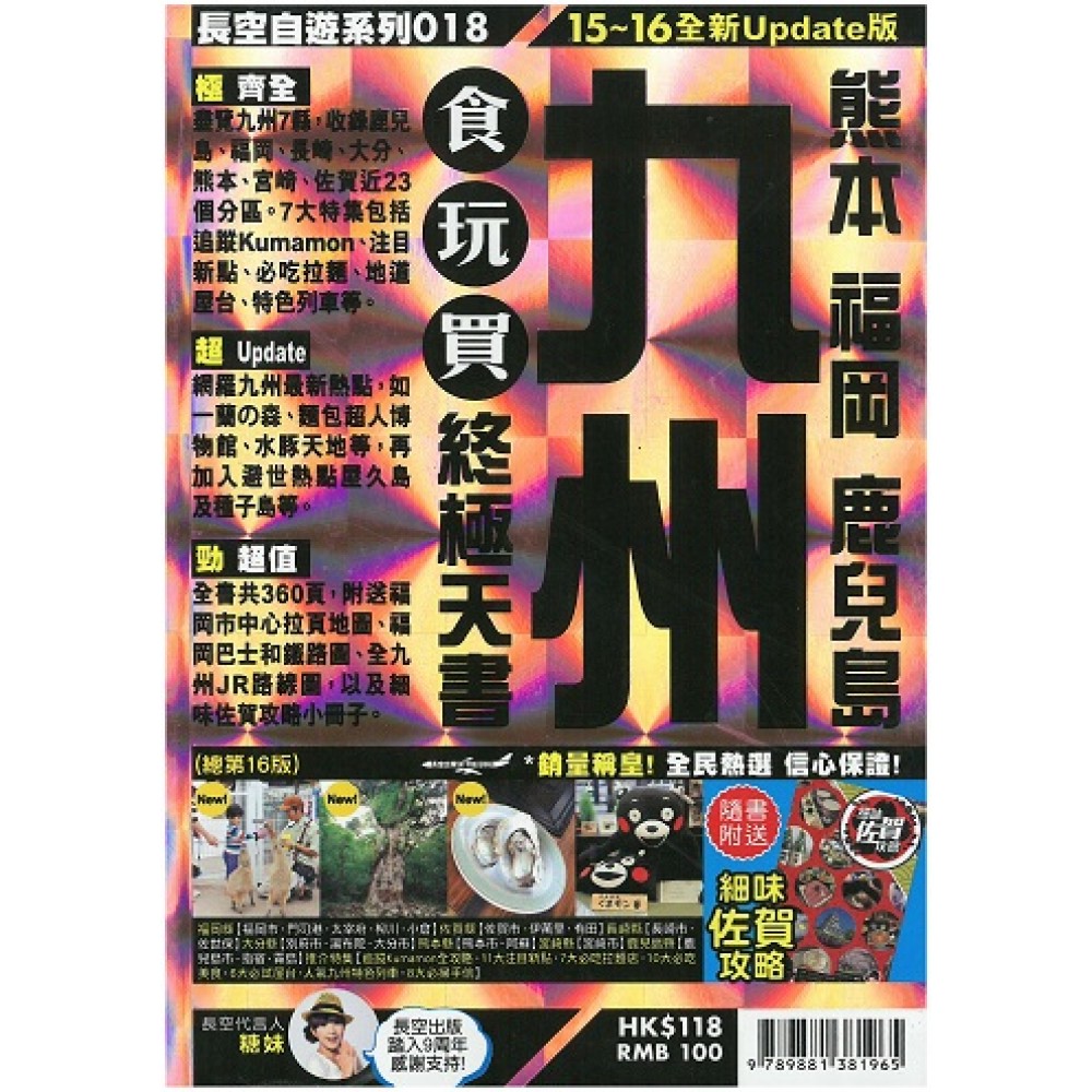 極齊全 盡覽九州7縣,收錄鹿兒島、福岡、長崎、大分、熊本、宮崎、佐賀近23個分區。7大特集包括追蹤Kumamon、注目新點、必吃拉麵、地道屋台、特色列車等。 超Update 網羅九州最新熱點,如一蘭の森、麵包超人博物館、水豚天地等,再加入避世熱點屋久島及種子島等。 勁超值 全書共360頁,附送福岡市中心拉頁地圖、福岡巴士和鐵路圖、全九州JR路線圖,以及細味佐賀攻略小冊子。 福岡縣【福岡市.門司港.太宰府.柳川.小倉】佐賀縣【佐賀市.伊萬里.有田】長崎縣【長崎市.佐世保】大分縣【別府市.湯布院.大分市】熊本縣【熊本市.阿蘇】宮崎縣【宮崎市】鹿兒島縣【鹿兒島市.指宿.霧島】推介特集【追蹤Kumamon全攻略.13大注目新點.8大必吃拉麵店.10大必吃美食.6大必試屋台.人氣九州特色列車.8大必掃手信】