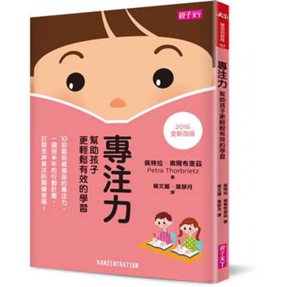【有效學習】雙書,專注力+學習動機,2016年好評改版再推出 從台灣本土現場出發,深入淺出汲取德國知名學習雜誌《焦點-學校》主題口袋書知識, 10招增進良好專注力的方法,為期一週到半年的短中長期專注力行動計畫,有效協助孩子練就專注力。 開啟專注密碼,幫助孩子找到熱衷與投入的關鍵! ★專注為何這麼重要? ★什麼是專注? ★如何辨識專注力不足? ★哪些事對增進專注力很重要? ★測試:我的孩子工作多專心? 內附:1.給孩子的15分鐘專注力測驗;2.給家長的10組注意力障礙因素查核表;3.協助孩子專心的家長與教師檢核表。 來自德國知名學習性雜誌《焦點-學校》知識書系,由大腦與學習專家擔綱顧問;深入了解專注力的來龍去脈,隨書附專注力測驗、短中長期專注力提升計畫,為學校、家庭提供最務實的建議。 2016年全新改版,特別增加來自教育教養雜誌《親子天下》編輯群採訪報導,特教領域學者孟瑛如專文闡述,從台灣現場出發,更貼近本土家長經驗。 讓孩子的學習更輕鬆有效! 今日的兒童與青少年,習慣了不斷的新刺激與快感式的滿足,要他們集中專注力好好的上一堂課,或是不拖泥帶水的把作業做完,是很難的事。然而,不專心無法學到東西。研究指出,40%的孩子有專注力的問題。他們容易在做作業時分心、偏離主題、耽於空想,嚴重影響成績。 專注是可以學習的。教育心理學家指出,孩子學習最重要能力的地方是家庭,而不是學校。身為父母,你可以幫助孩子學習更敏捷的思考以及更專注的基本能力,好讓孩子替未來的人生預做準備。 本書提出增進孩子專注力的10大實用方法,也提供父母設定目標的要領,採取正確步驟。例如:運用短期的行動計畫,幫助孩子迎接即將逼近的考試;採取中期的行動計畫,讓孩子發現學習的樂趣;或者以長期的行動計畫,幫助孩子徹底改變生活中的某些事,永久避免學習落後的情況。 專注力不只對學習很重要,對往後的生活也很重要。許多增進專注力的方法,在日常生活中唾手可得,只要善加利用,就可以有效增進孩子的專注力。書中並附有測驗與練習,方便父母採取合適的步驟與做法,幫助孩子。