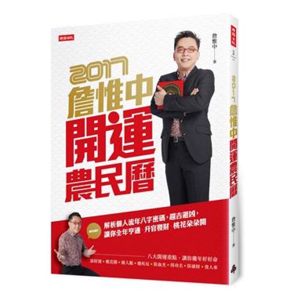 2017年最準確又完整的農民曆! 命理大師詹惟中利用天干+紫微,精算個人流年命盤 助你雞年平平安安、大雞大利! 去年適逢廉真星化忌,發生了不少與火和車禍相關的事件 不少讀者盛讚詹惟中老師的神預測 今年雞年流年跟個人命盤有什麼需要注意的地方呢? 詹老師提供八大開運重點: 添財運、桃花開、廣人脈、避疾厄、 防血光、得功名、防破財、找商機! 讓你簡單掌握自身運勢,好命一整年! 精通命理風水的詹惟中老師利用紫微斗數搭配天干,從出生年、月、時辰的個人命盤去精算對應的雞年流年運勢,更為精確、化繁為簡,單用數字就能找到自己的雞年運勢!此外,還結合居家風水的概念,教你利用擺設調整自身氣場、提升運氣,書末更提供十二生肖的年月運勢,一書在手,幫你招來好運、破除厄運,雞年大吉祥! 本書特色 ●最實用的開運工具書! 開運農民曆+個人運勢分析+12生肖年月運勢,一書在手,輕輕鬆鬆掌握每一天。 ●最準確的運勢解析書! 有別於一般運勢書用12生肖批算,以出生年月時辰的個人命盤分析,準確度更高。 ●流年結合風水,化險為夷 除了分析運勢,還配合個人流年提供居家風水建議,提升好運、避開厄運,整年都平安。 ※獨家收錄詹惟中老師「玖肆開運」4首單曲,讓你有聽有保庇! 由麻吉弟弟作曲,詹老師親自填詞,多位藝人跨刀拍攝 4首琅琅上口的旋律+Rap,簡單就能記住難懂的面相學及風水命理 把開運要訣隨著音樂收入心中,讓你擺脫負能量,人生玖肆開運!