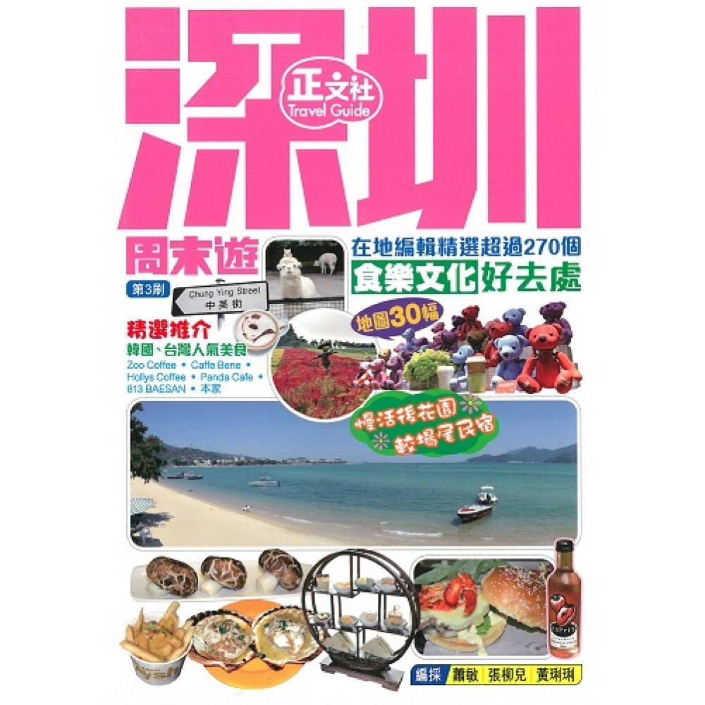 各區景點: 全書256頁,精細地圖30幅,全面更新深圳6大區、在地編輯精選食樂文化熱點超過270個,附深圳全市圖及最新地鐵路線圖。 羅湖區︰東門老街、京基100、萬象城、仙湖植物園、筍崗批發市場 福田區︰TERMINAL ONE、華強北商圈、八卦一路美食街、COCO Park、市民中心 南山區︰深圳野生動物園、中國民俗文化村、華夏藝術中心、歡樂海岸、海上世界 鹽田區︰大梅沙海濱公園、中英街歷史博物館、鹽田海鮮街 寶安區︰版畫村 龍崗區︰較場尾、大鵬所城、鶴湖新居、東山寺 基本內容: 新增人氣食店︰新輝記炭燒海鮮、堂小鍋、N Café、潤園四季椰子雞、柏樂坊、不自然博物館、水棲餐廳等 韓風來襲︰本家、Zoo Coffee、Caffe Bene、Hollys Coffee、稻穀家等 主題公園之都︰深圳野生動物園、仙湖植物園、世界之窗、海洋奇夢館、歡樂谷、東部華僑城、青青世界、小梅沙海洋世界、麥魯小城等 藝術文化及歷史地圖︰羅湖書城、中心書城、深圳博物館、OCT-LOFT創意文化園、中英街、宋少帝陵、何香凝美術館、招商局歷史博物館等 Just Relax & Fun~︰較場尾民宿、靜舍、台北純K Party、深圳動漫節、中小梅沙等 淘寶筆記︰KK Mall、益田假日廣場、東門町購物廣場、東門布料窗簾廣場、筍崗文具禮品批發市場、華強電子世界等 特色住宿攻略:回酒店、藍汐酒店、藍楹灣度假酒店、溫德姆、至尊酒店、美舍1號、貓頭鷹1號客棧、威尼斯酒店等