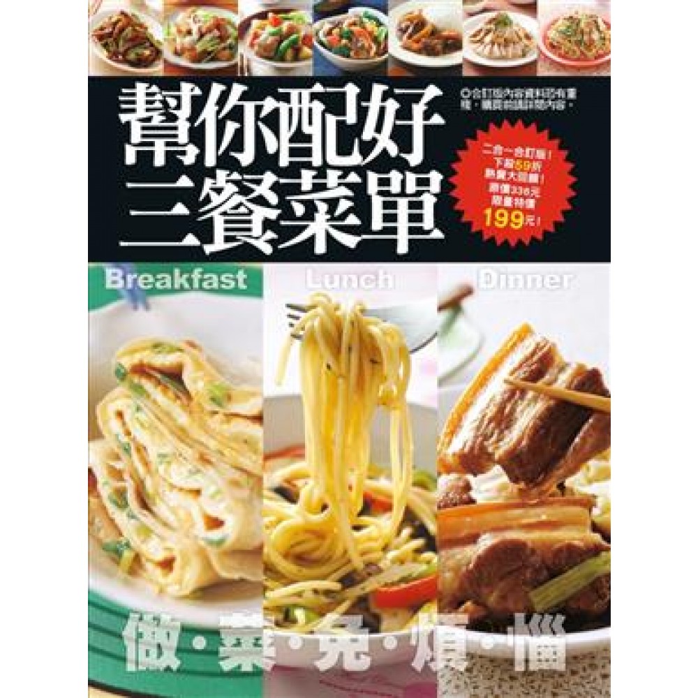 一天一種好吃早餐 Brunch:悠閒假日的早午餐 蕃茄起司歐姆蛋/義式炒磨菇/義式脆薯/燻鮭魚班迪克蛋/烤杏鮑菇/水果沙拉/檸檬炸蝦三明治/香料炒薯塊/生菜沙拉/野菇嫩雞捲/法國吐司/水煮火腿/義大利鄉村烘蛋/燻鮭魚生菜可頌/煎培根/青醬雞肉堡/新鮮脆薯/蔬菜棒/法式燻雞鑲蔓越莓/蘿蔓生菜沙拉/太陽蛋/美式水果煎餅/美式炒蛋/薯泥/香煎鮭魚排/奶油五穀飯/季節蔬菜/波本香料烤豬排/南瓜蔬菜燉飯/德國香腸/香煎雞腿排/炸薯條/迷迭香烤甜椒/日式鮪魚蝦卵飯糰/和風沙拉/玉子燒 搭配飲品 漂浮紅茶/冰可可/焦糖奶茶/草莓可爾必思/薰衣草方塊茶/英式三部曲/百匯水果冰茶/奇異果香蕉思慕奇/青柚香茶/香蘋茶/柚香紅茶/日式抹茶 活力滿點中式早餐 捏製中式飯糰超EASY 常用飯糰餡料:辣菜脯、 炒酸菜、雪裡紅、蔥花蛋/辣菜脯蔥花蛋飯糰/肉鬆滷蛋飯糰/鮪魚酸菜飯糰/綜合飯糰 煮粥的絕竅 清粥小菜:菜脯蛋、三色高麗菜、四季豆炒肉絲/台式鹹粥/皮蛋瘦肉粥/黃金雞肉粥/糙米蔬菜粥/五穀瘦肉粥/綠豆薏仁粥/雞絲潤餅卷/蔬菜潤餅捲/糙米薏仁飯/油飯/中式蛋餅/蔬菜蛋餅/蔥花煎餅/火腿蛋餅/蛋餅卷/蔬菜米蛋餅/玉米煎餅/芝麻燒餅夾乳酪蛋/養生地瓜卷/台式涼麵/傳統涼麵/蘑菇鐵板麵/黑胡椒鐵板麵/米粉湯/煎餃 搭配飲品 杏仁茶/鹹豆漿/烏龍奶綠/豆漿紅茶/麵茶/桂圓紅棗茶/古早味紅茶/甜菊桂花釀/麥茶/桂花烏梅汁/鴛鴦奶茶/冰鎮洛神花茶 變化多端異國早餐 土司知識家 總匯三明治/法式三明治/烤火腿三明治/水煮雞肉三明治/南瓜土司披薩/冰凍三明治/蔬菜烘蛋三明治/蘋果焦糖法式麵包/可樂餅三明治/香蕉花生醬土司/地瓜蒙布朗三明治/全麥水果卷/生機三明治/美式漢堡/燻雞潛艇堡/蝦仁豆漿烘蛋貝果/堅果魚堡/紐澳良烤雞堡/蜂蜜水果鬆餅/豆腐焦糖鬆餅/柳橙山藥日式沙拉/蜜桃蒟蒻沙拉/蘋果鮮蝦地瓜沙拉/凱薩沙拉 日式飯糰製作方式 鹽烤鮭魚飯糰/肉鬆飯糰/玉米鮪魚飯糰/和風涼麵/鮭魚茶泡飯 搭配飲品 紅茶拿鐵/熱奶茶/鮮果冰茶/白桃烏龍/冰菊普洱茶/蜂蜜檸檬蘆薈凍飲/蘋果多酚奶昔/水果優格醋飲/冰奶茶/柚檸香橘汁/伯爵奶茶/柳橙蘋果思慕奇/抹茶拿鐵/山藥奇異果優格/百香綠茶/抹茶煎茶/玄米綠茶 幫你配好一個月的三餐 活力早餐篇 中式飯糰、甜味飯糰、綜合飯糰、辣菜脯蔥花蛋飯糰、肉鬆滷蛋飯糰、玉米鮪魚飯糰 中式蛋餅、火腿蛋餅、火腿玉米蛋餅、培根蛋薄餅卷、素肉鬆蛋餅卷、蔬菜蛋餅 鮮蔬起司燒餅、總匯燒餅 白粥、地瓜粥、台式鹹粥、皮蛋瘦肉粥、玉米雞蓉粥、黃金雞肉粥 美式漢堡、黃金鮪魚沙拉堡 法式土司、楓糖法式土司、法式三明治、香蕉花生醬土司、蒜香烤土司、烤火腿三明治、總匯三明治 、青蔬貝果、香腸玉米煎蛋 營養午餐篇 黃金蛋炒飯、香腸蛋炒飯、什錦菇炒飯、鮭魚炒飯 台式經典炒麵、牛肉炒麵、什錦炒麵、日式炒烏龍麵、海鮮炒烏龍麵 蒜苗香腸蔬菜、和風水果咖哩燉肉、芋頭燉肉塊、辣酒洋蔥燉肉條、紅燒肉丸、辣炒肉末蓋飯、牛丼、黑胡椒牛柳拌醬、紅蘿蔔茸洋蔥牛肉片、牛肉咖哩飯、親子丼、牛蒡燴雞腿、照燒雞塊、和風燉嫩雞、金針木耳燉雞、三鮮拌醬、濃茄汁透抽煲、五色蔬菜魚塊、什錦珍菇拌醬、綜合蔬菜燴肉片 豐盛晚餐篇 蒜泥白肉、蔥爆肉片、蔥燒肉塊、京醬肉絲、咕咾肉、糖醋鳳梨里肌、椒麻豬排、煎豬肝、客家小炒、蠔油牛肉、滑蛋牛肉、宮保牛肉、泡菜炒牛肉、辣子雞丁、宮保雞丁、醬爆雞丁、蘆筍雞柳、豆酥蒸鱈魚、醋溜魚片、香煎鯧魚、煎肉魚、三杯透抽、椒鹽鮮魷、芹菜炒雙魷、滑蛋蝦仁、薑絲炒海龍、乾煸四季豆、培根炒高麗菜、醋溜高麗菜、蒜酥龍鬚菜、蒜炒花椰菜、辣炒箭筍、蔭豉苦瓜、鹹蛋苦瓜、豆豉茄子、麻油青江炒雞片、豆苗蝦仁、鴻禧菇炒茭白筍、玉米筍炒百菇、鹹蛋杏鮑菇、椒鹽杏鮑菇、蔥爆香菇、枸杞炒菇丁、薑燒鮮菇、雪裡紅炒豆乾丁、酸菜炒麵腸、醬香豆腐、客家米醬豆腐、韭菜油豆腐、嫩煎黑胡椒豆腐、蔥花菜脯蛋、九層塔煎蛋、蕈菇烘蛋、蔬菜蛋卷、海鮮蒸蛋、南部滷肉、瓜仔肉燥、魚香肉燥、香蔥肉燥、八寶肉醬、中式炸醬、家常滷味拼盤、豆輪滷肉、家常滷肉、貴妃牛腩、香菇滷雞肉、馬鈴薯燉肉、四川擔擔肉醬、蒜香乾拌麵、豬肉什錦麵、番茄肉醬義大利麵、野菇蔬菜麵、上海菜飯、竹筍雞肉飯、鮑菇炊飯、和風芋香炊飯、鯛魚鹹蛋菜飯