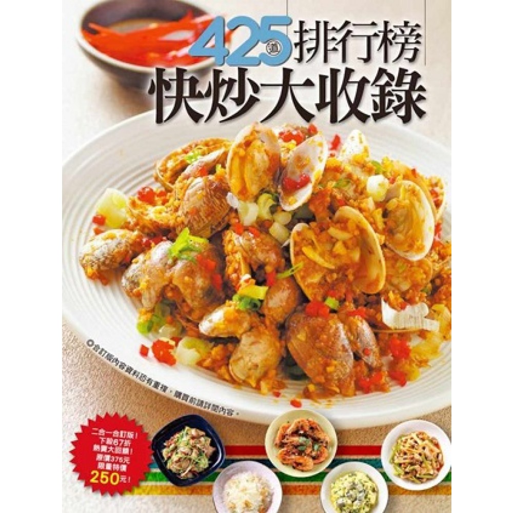 暢銷食譜二合一合訂版!原定價375元,限量特價250元!下殺68折大回饋! 本書是以下兩本書之合訂版,內容資料恐有重覆,購買前請詳閱內容。 【簡單作菜30】365道點菜率最高的家常快炒 其實快炒要好吃,還是有許多小秘訣的,例如:肉類事先過油可以保持肉質鮮嫩多汁、魚片要先醃過才會軟嫩、蔬菜要大火快炒;調味料也是門學問,例如:食材的前處理、有些辛香料要先爆香,以及需要多少的調味料比例等等。看似微不足道的小細節,若沒有注意,很容易變成讓料理失敗的關鍵。 本書共收錄了365道家常快炒料理,各種肉類、海鮮、蔬食一應俱全,除了與餐廳相同的大廚料理配方外,還要教大家許多料理小訣竅,不論是廚房新手或是喜愛烹飪的您,都能一學就會,簡單上手、輕鬆料理。 【新Q91】家常海鮮怎麼做最好吃 台灣的海鮮種類非常豐富,能夠變化的家常料理有很多,也很適合各種不同的烹調方式,不論是方便的大火快炒、最能保留原味的清蒸、清爽的水煮或是帶著麵衣香氣的油炸,每種不同的烹調方式都能巧妙的襯托出海鮮的鮮美與肉質的Q彈。雖然海鮮料理並不難,但許多人不喜愛海鮮的腥味,也擔心沒有料理好會讓海鮮的肉質變老,其實只要注意火候和煮的時間,料理海鮮就不容易失敗。吃海鮮不用上館子,在家就能品嚐最家常美味的海鮮料理,既衛生又省荷包!