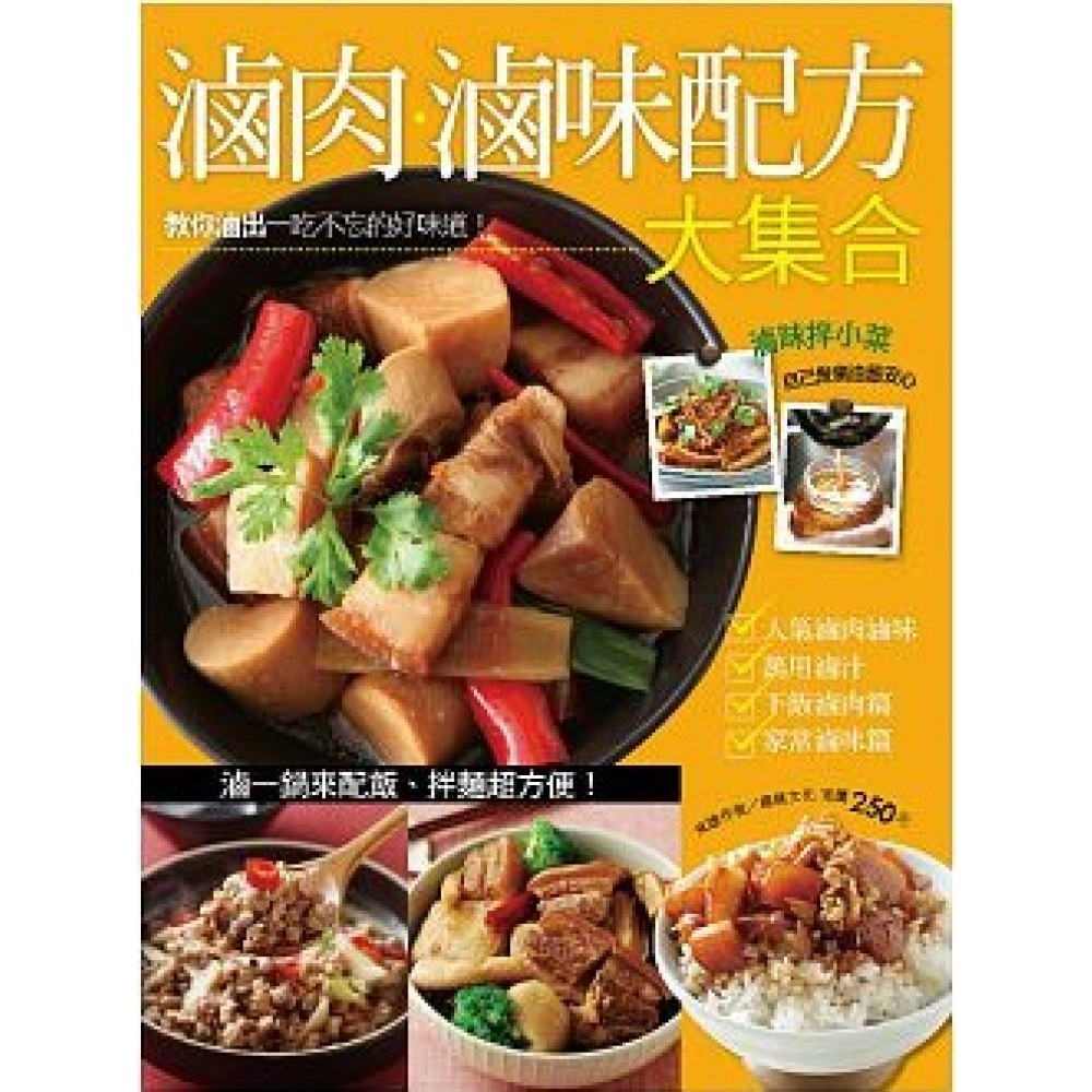 【經典滷肉滷味】 紅蔥肉燥、紅燒滷五花肉、焢肉、紅酒燉牛肉、綜合滷味…… 【萬用滷汁】 白滷汁、紅滷汁、廣式滷汁…… 【滷肉篇】 五香焢肉、角煮、醬燒肉塊、封肉、筍香滷肉、茶香滷肉、咖哩蘋果燉肉、豆瓣滷牛肉、和風燉嫩雞、香滷肉燥…… 【滷味篇】 ◎熱式滷味 茶葉蛋、五香腱子、綜合滷味拼盤、滷肥腸、醬滷牛腱、蒜油雞胗、鹹水鴨…… ◎冰鎮滷味 雞腳凍、滷雞胗、煙燻鴨翅、豬皮凍、煙燻百頁豆腐、滷五香豆干…… 【附錄】山東鴨頭