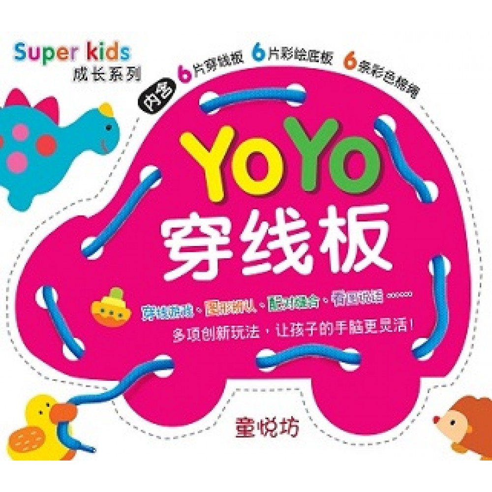本产品特别设计符合幼儿手部发育、易于操控的穿线板,以训练孩子手部的精细动作,达到手眼协调和学习控制肌肉的能力。另外,幼儿也可运用6个彩色底板和6个穿线板做图形配对、穿线缝合的游戏,多向学习,激发大脑发挥潜在的创造力。