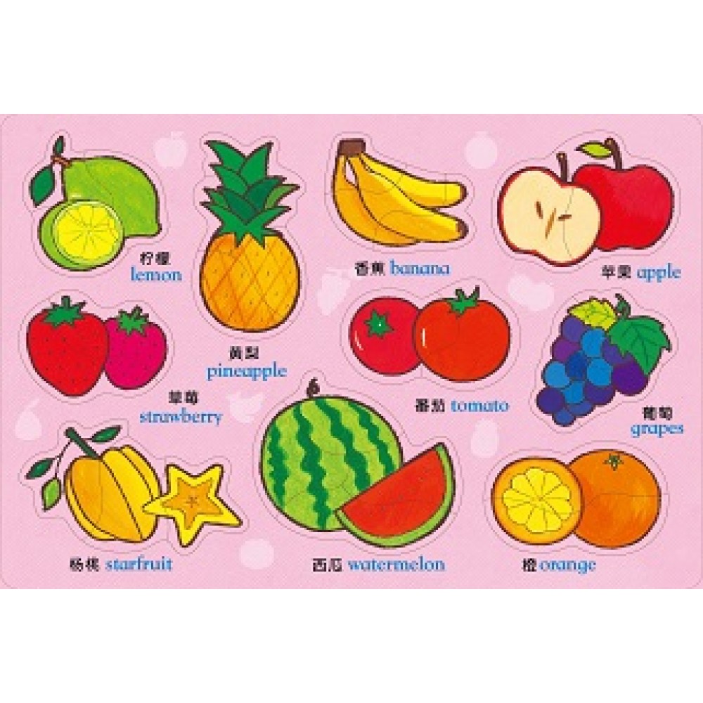 美味水果嵌入板拼图式的设计,可让孩子训练手眼协调,并建立部分与群体的概念;精心编绘的英文单字和可爱插图,则能加深孩子的学习印象和兴趣,轻松认识美味水果!