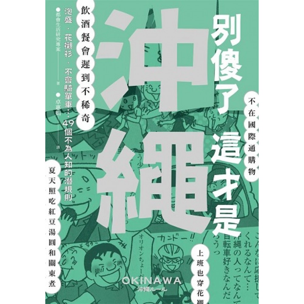 序言 .本書中常見的沖繩基本詞彙 交通篇 潛規則 1 步行距離超過十分鐘,就會毫不猶豫地開車 潛規則 2 不騎(不會騎)腳踏車 潛規則 3 酒駕根本稀鬆平常!(以前) 潛規則 4 基本上都買中古車 潛規則 5 要小心「WA」字開頭的車牌 潛規則 6 搭公車時務必小心! 購物篇 潛規則 7 以前是「SAN A」派現在是「MaxValu」派 潛規則 8 深夜到超市購物 潛規則 9 隨時常備「午餐肉」和「素麵」 潛規則10 不在國際通購物 潛規則11 為了節慶儀式不惜撒大錢 食物篇 潛規則12 提到飯糰的餡料,不是午餐肉煎蛋就是油味噌 潛規則13 天婦羅當零食 潛規則14 分得清沖繩麵、八重山麵及宮古麵的差異 潛規則15 夏天照吃善哉和關東煮 潛規則16 每個月吃一次肯德基 潛規則17 熱愛超大尺寸、巨無霸料理 潛規則18 提到喝酒,就是「泡盛」 街道篇 潛規則19 開車去速食店 潛規則20 其實很喜歡依地區來分派系 潛規則21 首里不算那霸市 潛規則22 在海灘幾乎不游泳 潛規則23 上班也穿沖繩花襯衫 潛規則24 撐陽傘卻不撐雨傘 潛規則25 離島不算沖繩? 詞彙、人際關係篇 潛規則26 沖繩以外的都道府縣都叫做「內地」 潛規則27 無不參與模合 潛規則28 長媳「真辛苦」 潛規則29 女人比男人更勤勞 潛規則30 飲酒聚會遲到不稀奇 潛規則31 搭腔時常說:「所以我就說嘛~」 潛規則32 不能反抗沖繩的「阿嬤」 潛規則33 「阿嬤」是尊稱 潛規則34 讚美時就說「上等!」 潛規則35 靈活運用三大語尾「~saa」、「~yoo」、「~nee」 潛規則36 「來」就是「去」 潛規則37 用名字稱呼彼此 潛規則38 牙膏叫高露潔,救急絆叫利巴貼布 潛規則39 搞不清楚親戚到底有多少人 潛規則40 祖先比什麼都重要 番外篇 潛規則41 婚禮請兩百人左右沒什麼好大驚小怪 潛規則42 吹指笛、跳琉球手舞 潛規則43 沒有固定就診的醫生,只有固定請示的靈媒 潛規則44 必看沖繩代表出場的甲子園 潛規則45 提到報紙,就是琉球新報和沖繩時報 潛規則46 其實對毛髮濃密感到困擾 潛規則47 曾經(在酒席上)爭吵過沖繩獨立話題 潛規則48 出外打拼以返鄉為前提! 潛規則49 「大而化之」是了不起的處世之道