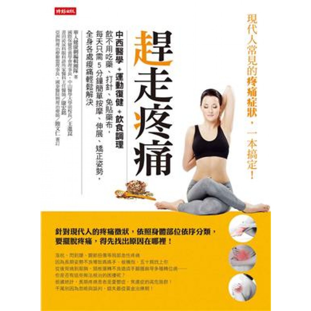 Ch1認識疼痛:我的人生拒絕唉聲嘆氣! 身體為何總在隱隱作痛? 忍受痛?管理痛?遠離痛…… 有效管理疼痛,讓生活更美好 Ch2疼痛是警訊?身體的抗議切莫輕忽…… 身體在求救!9種疼痛警訊停看聽 疼痛大觀園,分布區域詳解 【頭、肩、頸部】 ◆頭痛 ◆落枕 ◆沾黏性肩關節囊炎(五十肩) 【胸背+腰臀部】 ◆膏肓痛(上背痛) ◆腰椎間盤突出 ◆坐骨神經痛 ◆僵直性脊椎炎 【上肢部位】 ◆肘部外上髁炎(網球肘) ◆狹窄性肌腱滑膜囊炎(媽媽手) ◆腕隧道症侯群(滑鼠手) ◆板機指 【下肢部位】 ◆退化性關節炎 ◆小腿抽筋 ◆足底筋膜炎 ◆拇趾外翻 【全身】 ◆纖維肌痛症 ◆骨質疏鬆症 ◆帶狀疱疹後神經痛(皮蛇) ◆高尿酸血症(痛風) Ch3和平共處不容易,疼痛如何解套? 西藥觀點:「止」痛 ◆不怕傷肝腎,認識4大止痛藥 ◆怕吃藥?藥物成癮與副作用 ◆現代人「藥」注意,謹慎保平安 復健理論:「管理」痛 ◆何謂復健科?常見檢查項目有哪些? ◆復健科常用的治療方式 中醫觀點:「治」痛 ◆痛則不通,通則不痛 ◆穴位推拿:打通氣結血瘀,有效減輕疼痛 ◆小針刀:針刺感伴隨微創手術,疼痛立解 ◆刮痧:擴張毛細血管,疏通全身經絡 Ch4舒食療法:止痛,就從餐桌開始…… 【舒緩落枕】 ◆生薑紅棗茶/葛根粥/牛蒡子粥/山藥薏仁粥/珍珠母粥 【改善肩頸僵硬】 ◆舒經活血養生茶/杜仲補腎飲/葛根玫瑰飲 【保養關節】 ◆辛火燎原 【預防小腿抽筋】 ◆牛膝當歸山藥排骨湯/十全大補方 【補充鈣質】 ◆牛蒡蔬菜豆腐渣/鮮奶吐司煎餅/黑芝麻水果奶酪 【預防痛風】 ◆青木瓜水泡茶